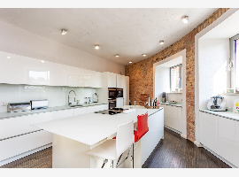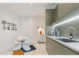 Die Wohnung beeindruckt durch ihre erstklassige Ausstattung. Die offen gestaltete Einbauküche fördert den Austausch mit Gästen und ist bestens ausgestattet: Sie verfügt über Ober- und Unterschränke, eine Dunstabzugshaube, Kochplatte, einen Geschirrspüler...
