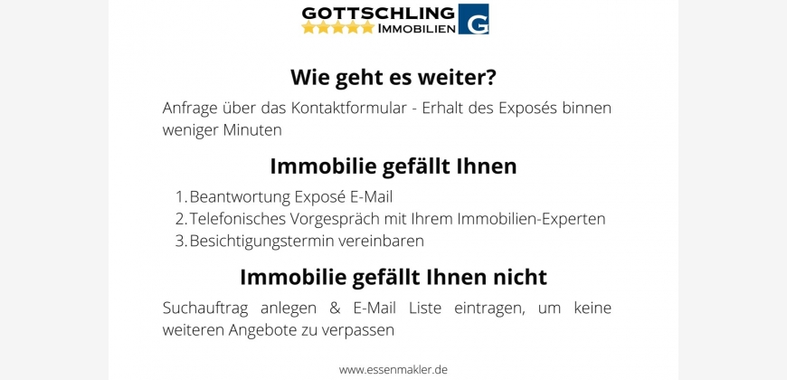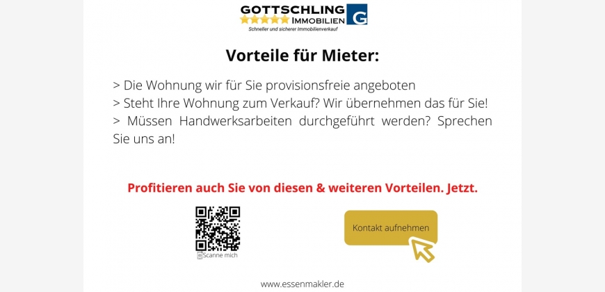 Willkommen zu Ihrem neuen Zuhause! Diese gepflegte Etagenwohnung in zentraler Lage von Essen bietet Ihnen eine Wohnfläche von ca. 71 m², verteilt auf 2 Zimmer. Die Wohnung befindet sich im 2. Stock eines dreigeschossigen Gebäudes aus dem Baujahr 1960. Die Wohnung verfügt über ein Schlafzimmer, ein modernes Badezimmer mit Tageslicht und Badewanne sowie ein luftigeres Wohnzimmer mit direktem Ausgang zum Balkon. Der großzügige Balkon zur Südseite lädt zum Entspannen und Verweilen ein. Die Ausstattung umfasst Satelliten- und DVBT2HD-Fernsehen, einen vorhandenen Internetanschluss sowie eine Zentralheizung, die das Gebäude mit effizienter Fernwärme versorgt. Ein Waschmaschinenanschluss ist im gemeinschaftlich genutzten Waschkeller vorhanden. Für zusätzlichen Stauraum sorgt ein zugeordneter Kellerraum und ein Trockenboden mit gespannten Leinen. Eine Garage kann auf Wunsch für 80 € monatlich separat angemietet werden. Für die Wohnung wird ab dem 01.12.2024 ein Nachmieter gesucht. Die Einbauküche kann übernommen werden. Haustiere sind in diesem Objekt nicht gestattet. Der Energieverbrauchskennwert beträgt 131,00 kWh/(m²*a), gemäß dem vorliegenden Verbrauchsausweis. Die Kunststofffenster sind isolierverglast und sorgen für eine hervorragende Energieeffizienz. Warmwasser wird im Bad durch einen Durchlauferhitzer und in der Küche durch ein Untertischgerät bereitgestellt. Vereinbaren Sie noch heute einen Besichtigungstermin und überzeugen Sie sich selbst von der Qualität und dem Charme dieser ansprechenden Etagenwohnung!- 2 Zimmer - moderner Grundriss - Stilvolle Einbauküche mit E-Geräten, optional vom Vormieter zu übernehmen - Balkon für entspannte Stunden im Freien - Badezimmer mit Tageslicht und BadewanneHolsterhausen ist ein Stadtteil von Essen, der durch seine zentrale Lage und exzellente Verkehrsanbindung hervorsticht. Besonders die Nähe zur A40 bietet eine ideale Verbindung sowohl in Richtung Dortmund und Bochum als auch in Richtung Duisburg. Darüber hinaus ist die A52 schnell erreichbar, was eine direkte Anbindung an Düsseldorf ermöglicht. Diese Verbindungen machen Holsterhausen für Pendler äußerst attraktiv, da wichtige Städte in der Umgebung gut und zügig erreicht werden können. Ein weiterer Pluspunkt ist die Nähe zur Universitätsklinik Essen, die sich direkt in Holsterhausen befindet. Dies ist besonders vorteilhaft für die Mitarbeiter des Klinikums, da sie von kurzen Arbeitswegen profitieren. Zusätzlich sorgt die Nähe zu wichtigen Verkehrsknotenpunkten dafür, dass der Flughafen Düsseldorf schnell erreichbar ist, was für Geschäftsreisende ein großer Vorteil ist. Holsterhausen bietet nicht nur eine hervorragende Verkehrsanbindung und die Nähe zur Universitätsklinik Essen, sondern auch eine sehr gut ausgebaute Infrastruktur für den täglichen Bedarf. In fußläufiger Entfernung befindet sich die Einkaufsstraße von Holsterhausen – die Gemarkenstraße. Hier finden Anwohner eine Vielzahl an Geschäften, die alle wichtigen Besorgungen des Alltags abdecken. Auf der Gemarkenstraße gibt es Supermärkte wie Rewe, Edeka und Netto, diverse Bäckereien, zahlreiche Friseure sowie Arztpraxen und Apotheken. Die Straße ist das pulsierende Herz des Stadtteils und bietet alles, was man für das tägliche Leben benötigt, incl. dem Wochenmarkt. Diese Vielfalt an Angeboten und die Nähe zu den Wohngebieten machen Holsterhausen besonders attraktiv für berufstätige Menschen, die auf kurze Wege Wert legen. Insgesamt ist Holsterhausen durch die Kombination aus starker Verkehrsanbindung und der Nähe zu einer der größten medizinischen Einrichtungen der Region ein äußerst attraktiver Stadtteil, sowohl für Pendler als auch für Klinikpersonal.Es liegt ein Energieausweis zur Besichtigung vor. Wesentlicher Energieträger der Heizung ist Fernwärme. Die Vermietung erfolgt im Namen und Auftrag des Eigentümers für Sie provisionsfrei. Bitte haben Sie dafür Verständnis, dass wir aufgrund der gesetzlichen Vorschriften (Datenschutzgrundverordnung, Verbraucherwiderrufsrecht, Geldwäschegesetz etc.) ausschließlich schriftliche Anfragen mit vollständiger Namens- und Adressangabe bearbeiten können. Nutzen Sie bitte dafür das Kontaktformular. Vielen Dank für Ihr Verständnis. PS. Weitere Immobilienangebote finden Sie unter 8888888888888888888888888