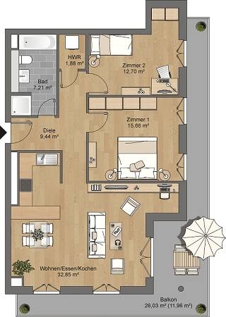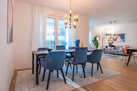 Diese hochwertige 3-Zimmer-Wohnung mit ca. 92 m² Wohnfläche befindet sich in einem eleganten Wohnensemble zwischen Saone- und Hahnstraße. Die Wohnung überzeugt durch einen offen geschnittenen Grundriss, bodentiefe Fenster und Fußbodenheizung. Highlight ist die großzügige Terrasse. Ihr persönlicher Rückzugsort mitten in der Stadt.