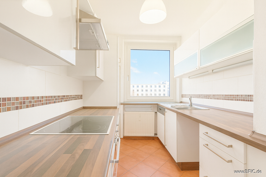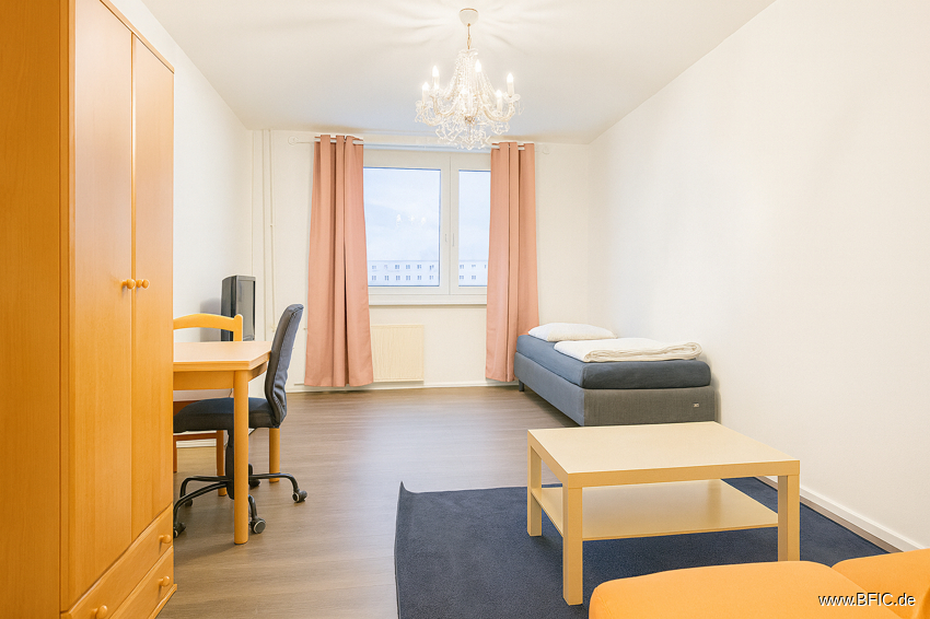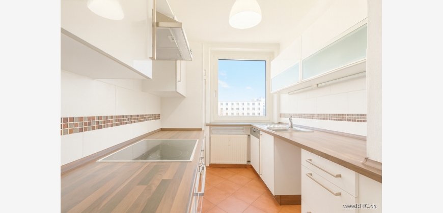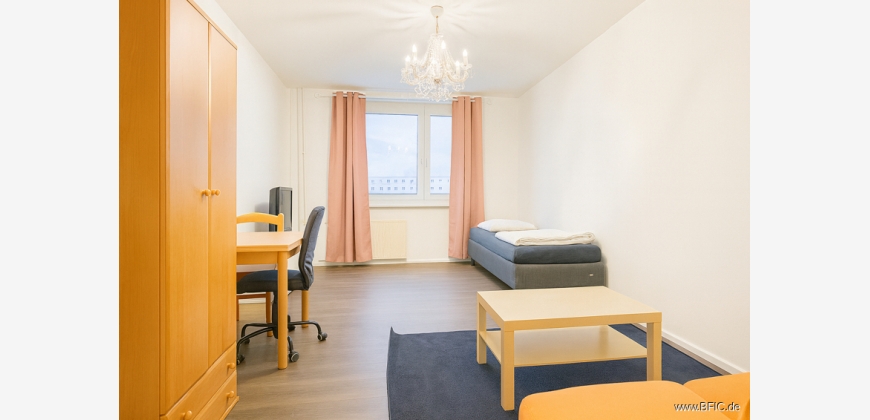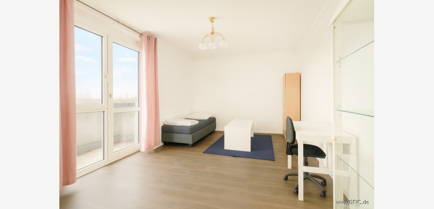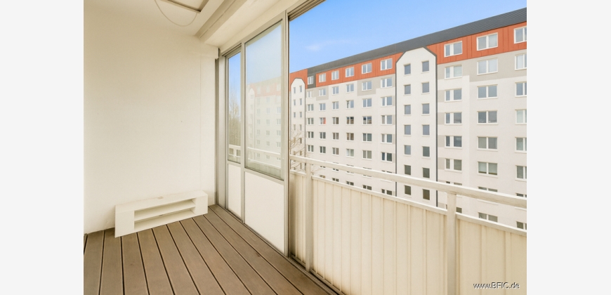 The apartment on offer is located on the seventh floor of a well-kept residential building in Berlins Sewan district and is fully furnished. It was specially designed for use as a shared apartment and offers a total of three private rooms, each of which is individually furnished and thus creates pleasant retreats for each resident. The kitchen, bathroom and glazed loggia form the communal areas. The apartment has laminate flooring, a fully fitted kitchen with all major appliances and a renovated bathroom with bathtub. The glazed loggia extends the living space and offers a sheltered, bright lounge area that is ideal for relaxing or sitting together. The house is equipped with an elevator, making it easy to reach the upper floor. The energy certificate will be presented at the viewing.The location of the apartment in a quiet side street of the Sewanviertel is characterized by lots of greenery, well-kept courtyards and a pleasant living environment. Despite the quiet atmosphere, the public transport connections are excellent. The Tierpark subway station, which is served by the U5 line, is within easy walking distance; from there you can get directly to Alexanderplatz in around fifteen minutes. Several bus lines are also in the immediate vicinity and offer fast connections to the surrounding districts. Shopping facilities for daily needs, various stores, a medical center and several daycare centers are also just a few minutes walk away, making everyday life extremely convenient. For recreation and leisure, the nearby Tierpark Berlin offers ideal conditions for walks and outdoor activities. Together with the tree-lined paths and the spacious inner areas of the neighborhood, this creates a balanced living environment that combines both tranquillity and easy accessibility. This combination makes the apartment particularly attractive for professionals, students, project workers and people who are new to Berlin and looking for a fully equipped, reliable living solution. Small groups who would like to rent a complete shared flat together will also find ideal conditions here.