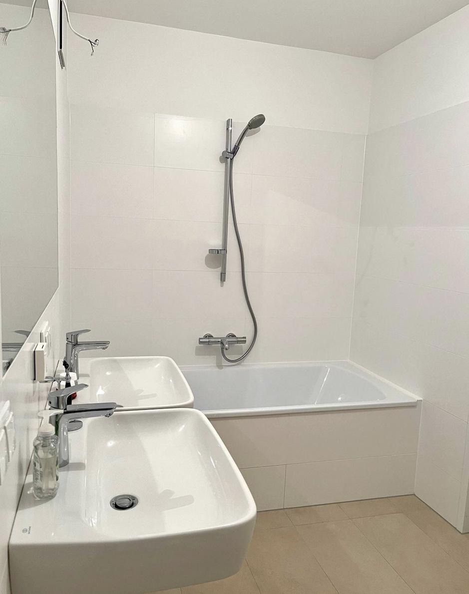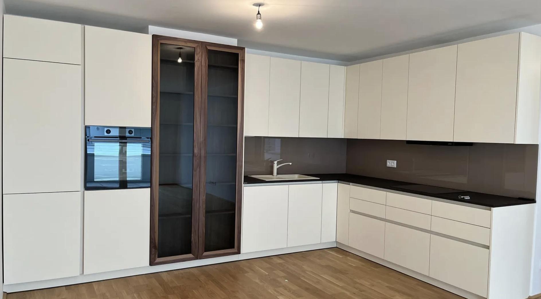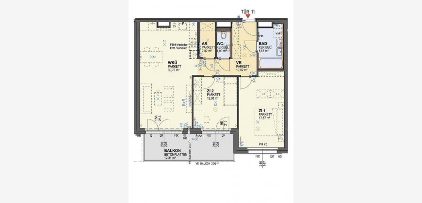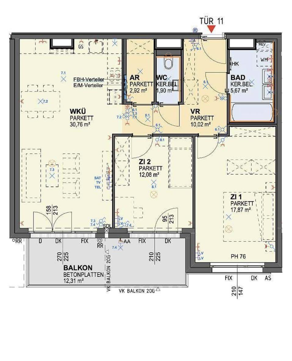 Diese stilvoll modern gestaltete Wohnung befindet sich im zweiten Obergeschoss einer privaten Wohnanlage. Sie ist barrierefrei konzipiert, sodass alle Räume ebenerdig sind. Zudem ist die Wohnung mit Fußbodenheizung, hochwertigem Echtholzparkett, ferngesteuerten Sonnenschutz-Jalousien, einer Einbauküche mit maßgefertigtem Weinglasregal sowie einer Badewanne im Badezimmer ausgestattet. Die ruhige Lage im Innenhof garantiert eine angenehme Wohnatmosphäre. Trotz der Helligkeit in der Wohnung bleibt diese kühl, da sie nicht der direkten Sonneneinstrahlung ausgesetzt ist. Der einladende Vorraum bietet viel Raum für kreative Einrichtungsideen und führt in das großzügige Wohn-Esszimmer (ca. 30,76 qm). Weiterhin verfügt die Wohnung über ein Schlafzimmer (ca. 17,87 qm), ein Kinderzimmer/Büro (ca. 12,08 qm), einen Abstellraum (ca. 3 qm), ein geräumiges Badezimmer mit Badewanne (ca. 5,67 qm), ein WC mit Waschbecken (ca. 1,90 qm) und einen Keller (ca. 2,61 qm). Eine Loggia-Balkonkombination (ca. 12,3 qm) bietet einen schönen Blick in den Innenhof.