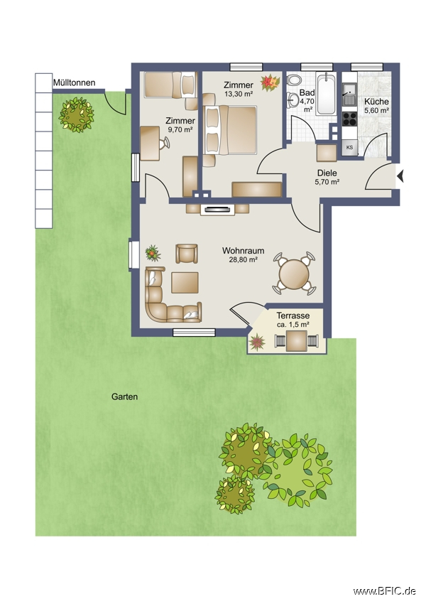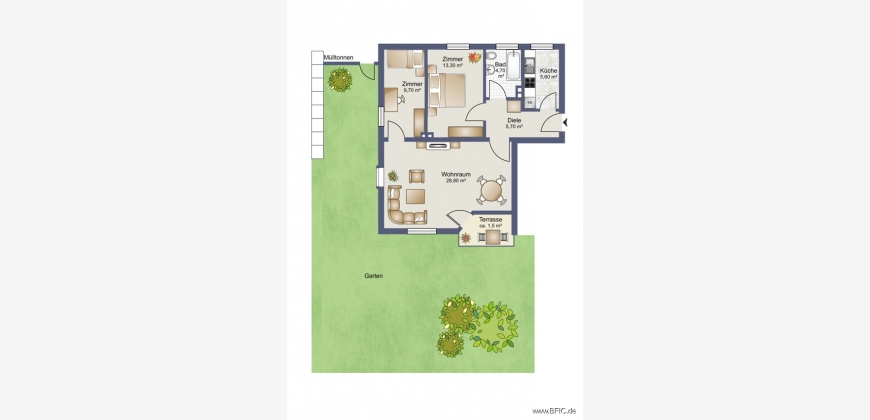 Diese 3-Zimmer-Gartenwohnung in der Schillerstraße 43 in Fürstenfeldbruck bietet ein Wohnambiente mit seltenem Charakter. Der Gartenanteil umschließt die Wohnung auf zwei Seiten und schafft viel Privatsphäre sowie ideale Bedingungen für alle, die Freude an Natur, Pflanzen und einem aktiven Gartenleben haben. Über die verglaste Terrassentür sowie einen separaten Gartenzugang gelangt man direkt in den privaten Außenbereich. Ein kleines Gartenhäuschen bietet zusätzlichen Stauraum. Das Wohnzimmer ist hell, großzügig und mit einem gemütlichen Kachelofen ausgestattet. Alle Räume verfügen über Fenster, wodurch die gesamte Wohnung sehr freundlich und gut belichtet ist. Die beiden Schlafzimmer sind gut geschnitten und vielseitig nutzbar. Die Küche ist separat begehbar. Das Tageslichtbad verfügt über eine Badewanne. Zur Wohnung gehört ein Kellerraum mit Fenster sowie ein eigener Anschluss für Waschmaschine und Trockner im Untergeschoss. Eine große Garage kann zu einem späteren Zeitpunkt zusätzlich angemietet werden. Die Wohnung eignet sich ideal für Personen, die ein ruhiges Wohnumfeld, einen schönen Garten und eine funktionale Raumaufteilung bevorzugen. Ausstattung Erdgeschoss, ca. 75 m² Wohnzimmer, zwei Schlafzimmer, Küche, Bad mit Wanne, alle Räume mit Fenster Sehr großer Gartenanteil auf zwei Seiten Verglaste Terrassentür und separater Zugang zum Garten Kleines Gartenhäuschen Kachelofen im Wohnzimmer Gas-Zentralheizung Fenster erneuert ca. 2005 Kellerraum mit Fenster Waschmaschinen- und Trockneranschluss im Keller Heckenschnitt einmal jährlich Garage optional zu späterem Zeitpunkt anmietbar Frei ab 01.01.2025 oder 15.01.2025 Energieangaben Verbrauchsausweis Baujahr Gebäude 1970 Modernisierungen: Gas-Zentralheizung 2005, Fenster erneuert 2005 Energieträger Gas Energieverbrauchskennwert ca. 145 kWh/(m²·a) Energieeffizienzklasse E Warmwasser enthalten Mietkonditionen Nettokaltmiete 1.575,00 Euro (3 Jahre fest, anschließend Indexklausel) Heiz- und Nebenkostenpauschale 400,00 Euro Gesamtmiete 1.975,00 Euro Kaution 4.725,00 EuroDie Wohnung befindet sich in ruhiger und gewachsener Wohnlage der Schillerstraße in 82256 Fürstenfeldbruck. Bushaltestellen befinden sich in fußläufiger Entfernung, der S-Bahnhof Fürstenfeldbruck (S4) ist ebenfalls schnell erreichbar. Die Fahrzeit nach München-Pasing beträgt rund 15 bis 20 Minuten, zum Münchner Hauptbahnhof etwa 25 bis 30 Minuten. Eine gute verkehrliche Anbindung besteht über die B471, B2 sowie die Autobahnen A8 und A99. Einkaufsmöglichkeiten wie Rewe, Edeka, Lidl, Bäckereien, Apotheke und Gastronomie befinden sich im näheren Umfeld. Die Innenstadt von Fürstenfeldbruck ist in wenigen Minuten erreichbar und bietet vielfältige Einkaufsmöglichkeiten, Wochenmarkt und Dienstleistungsangebote. Für die Freizeitgestaltung bieten sich die Amperauen, Rad- und Spazierwege, das Klosterareal Fürstenfeld mit Park, Kulturhaus und Biergarten sowie Sportvereine und das Freibad an. Das Wohnumfeld ist ruhig, grün und bietet einen hohen Erholungswert.