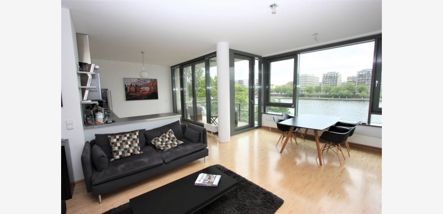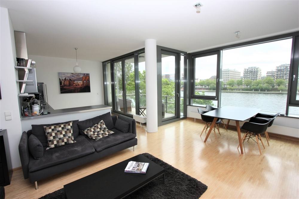 FRANKFURT-WESTHAFEN - Die auf Frankfurts einziger bebauter Halbinsel gelegenen Wohnungen bieten hohen Komfort und außergewöhnliches Wohnen!! Das Ambiente dieser Solitäre muss man gesehen und erlebt haben. Raumtiefe Fenster und der davor gelegene Balkon geben den Blick frei vom Wohnbereich auf den Main. Gute Gastronomie, öffentliche Verkehrsmittel, alle Einkaufsmöglichkeiten und den Frankfurter Hauptbahnhof erreicht man fußläufig. Kurze Wege zu den Autobahnauffahrten in alle Richtungen und zum Flughafen.