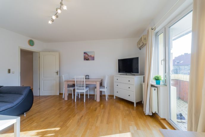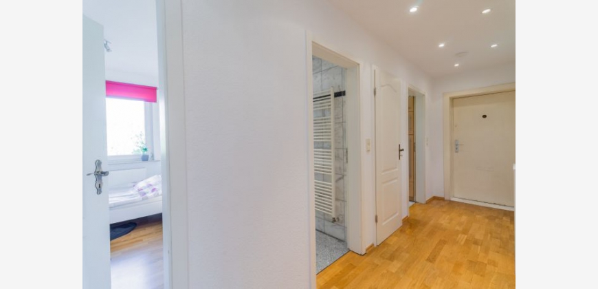 Schöne, helle 3 Zimmerwohnung mit Echtholzparkett, Granitbad und Klimaanlage-komplett möbliert, 2 Schlafzimmer, Kleiderschrank, Kommode, Nachttisch sowie separater voll ausgestatteter Einbauküche mit Herd, Backofen, Kühlschrank, Mikrowelle, Spülmaschine.-Getrennter Abstellraum inkl Waschmaschine innerhalb der Wohnung-Absolut WG tauglich da beide Zimmer vom Flur zugänglich und im Schnitt sehr ähnlich. 4. von 4 Etagen, daher keine Lärmbelästigung oder Schritte von Nachbarn von oben- leider kein Aufzug vorhanden! This recently renovated, fully furnished 3 bedroom apartment welcomes you with a fully equipped kitchen including all common utensils such as fitted kitchen with dishwasher, pots, pans, plates, glasses, cutlery and a small and a large bedroom with each bed, wardrobe, bedside tables, etc, and a spacious Living room with a huge sofa bed, work desk with desk and a west-facing balcony. Another extra bed is available if required. Both bedrooms are facing the garden and turned away from the street, so you can escape the traffic noise in Berlin as much as possible. Own small separate storage room for washing machine inside the apartment. Real wood parquet in living and bedrooms, as well as in the hallway. Air conditioning in the living room. Double glazing throughout the apartment. If needed, furniture can be adapted to your needs. Tempelhof nähe Tempelhofer Damm. Direkte Verbindung zur Friedrichstraß, Stadtmitte und Kreuzberg. Close to metro station leading straight to city centre, eg Kreuzberg, Mitte, Friedrichstraße