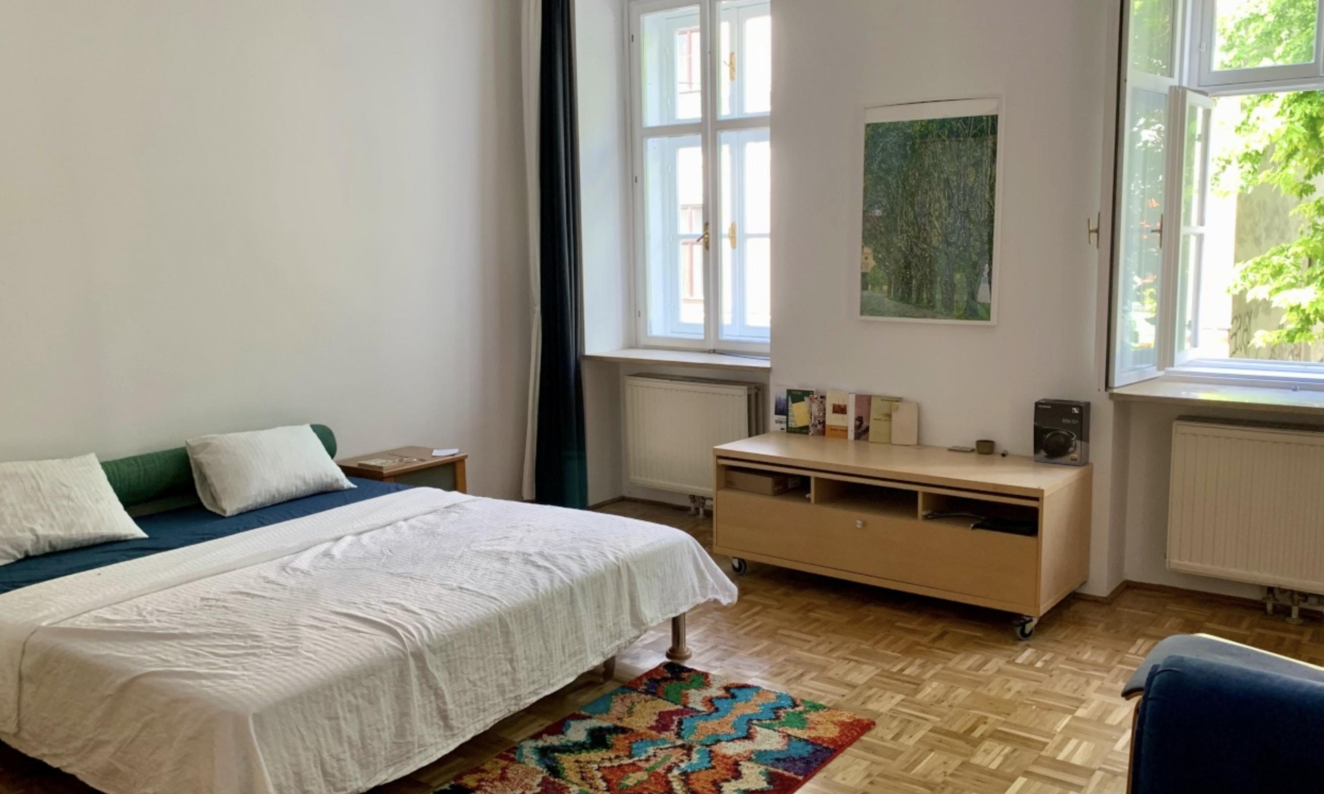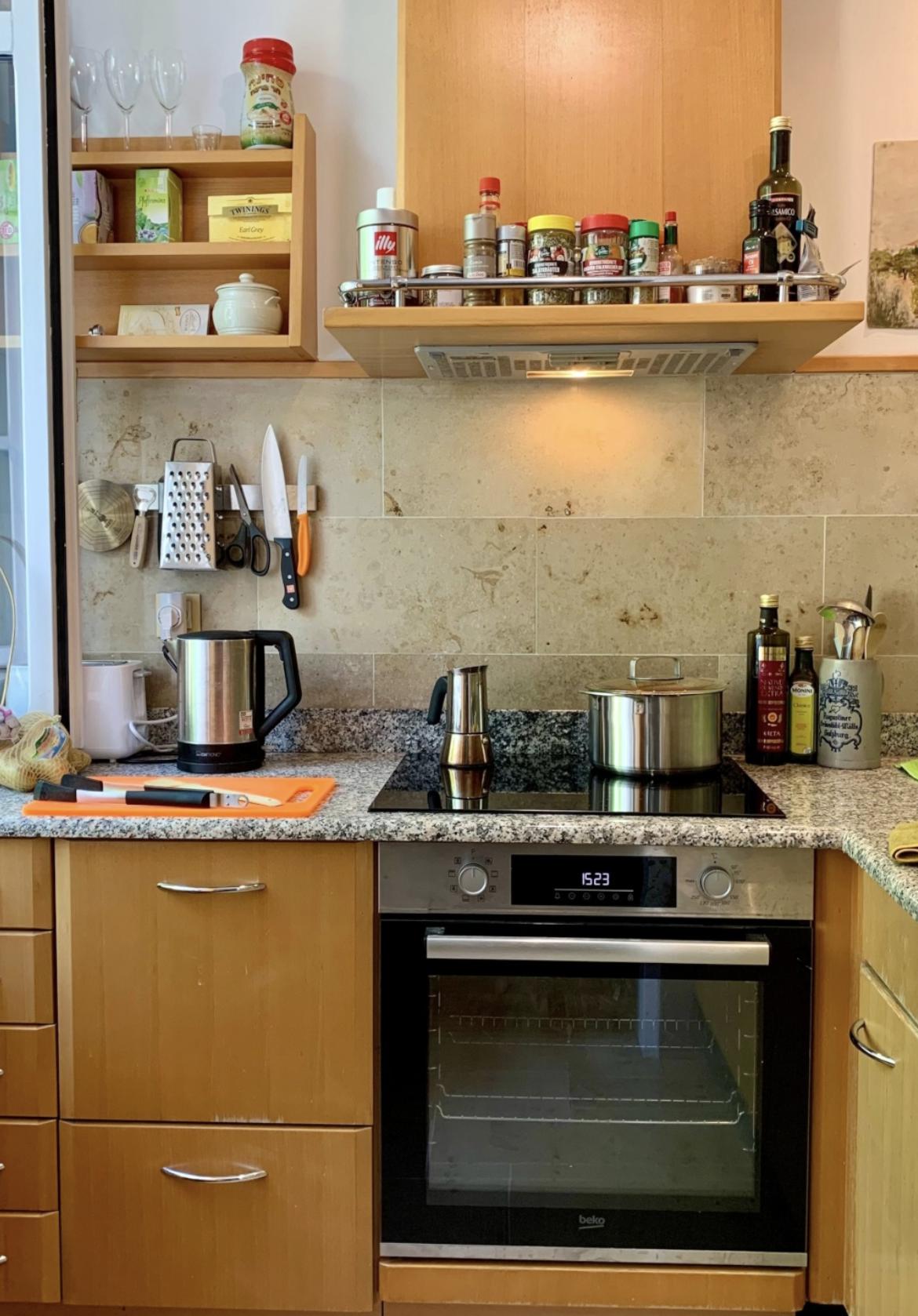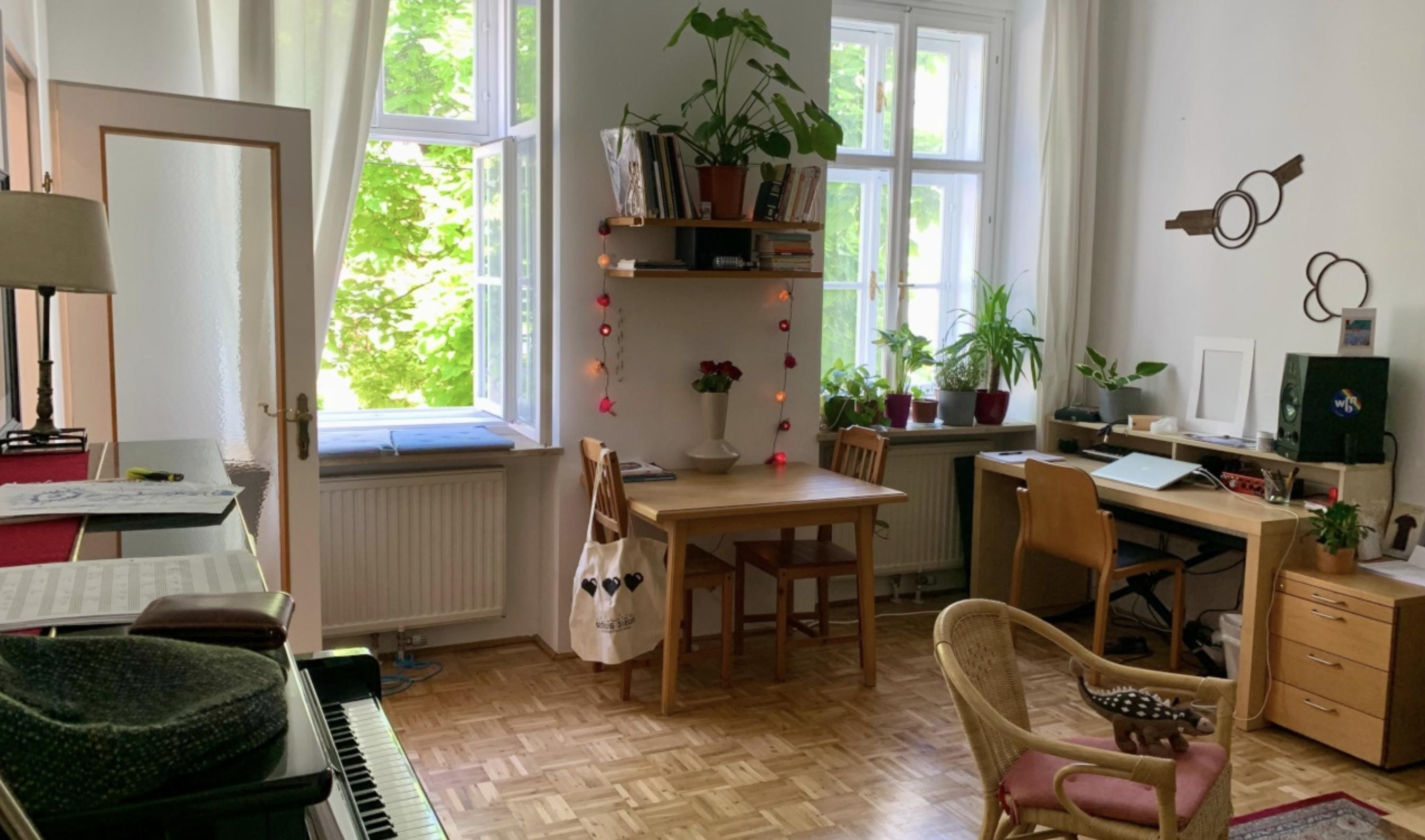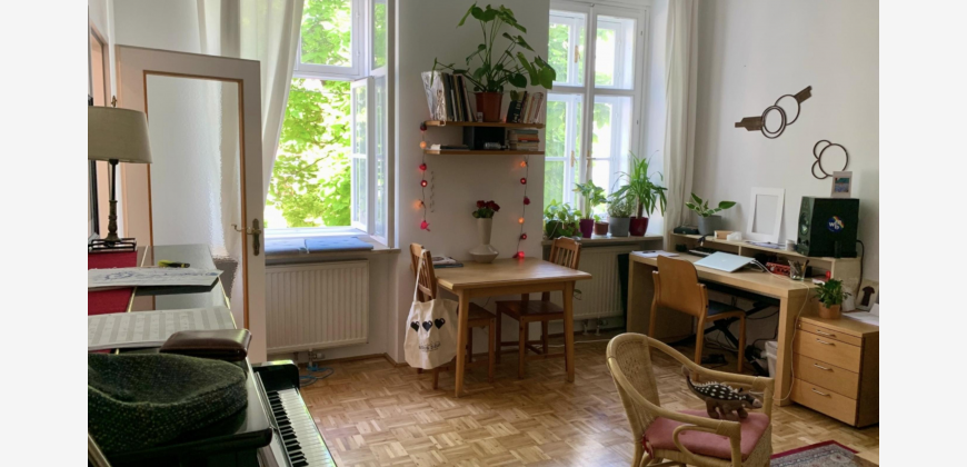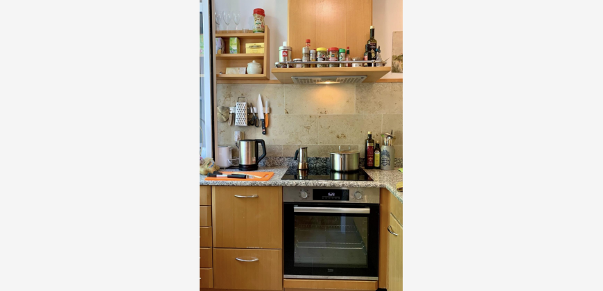 Wir bieten unsere attraktive und bequem möblierte 55qm 2-Zimmer-Unterkunft an, die komplett eingerichtet zur Verfügung steht. Die Wohnung besitzt eine lichte und vollständig ausgerüstete Küche mit Spülmaschine, Speiseecke und Zugang zur Terrasse, die in Richtung des friedlichen Innenhofs ausgerichtet ist. Die Terrasse hat Raum für zwei Personen und die Gelegenheit, dort zu frühstücken oder abends im Freien zu verweilen. Das Wohnzimmer bietet reichlich Platz für Bücher und alles, was du zum Leben benötigst. Es ist neben dem Essplatz in der Küche das Zentrum der Wohnung und mit einem klappbaren Sofa, einem Lehnstuhl ausgestattet. Darüber hinaus steht ein über 2-Meter langer Arbeitstisch. Das Tageslicht-Badezimmer wird durch zwei Fenster sehr hell und ist besonders weitläufig, sodass eine Wanne und Regendusche bequem darin Platz haben. Ein Waschtrockner und ein Spiegelschrank gehören ebenfalls dazu. Das Schlafgemach bietet diverse Aufbewahrungsmöglichkeiten wie einen Schrank, eine Truhe und eine Kleiderstange. Vom 180x200cm umfassenden Doppelbett aus hat man einen schrägen Blick auf die Bäume vor dem Gebäude. Vom Korridor mit Schuhgestell, Kleiderhaken und kleiner Kommode führt außerdem ein kleiner Lagerraum ab, der das Unterbringen von Reinigungsmitteln und Staubsauger erleichtert. Wir freuen uns auf eine oder zwei Personen, die unsere charmante Wohnung in ruhiger Lage zu ihrem Heim machen möchten.
