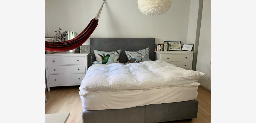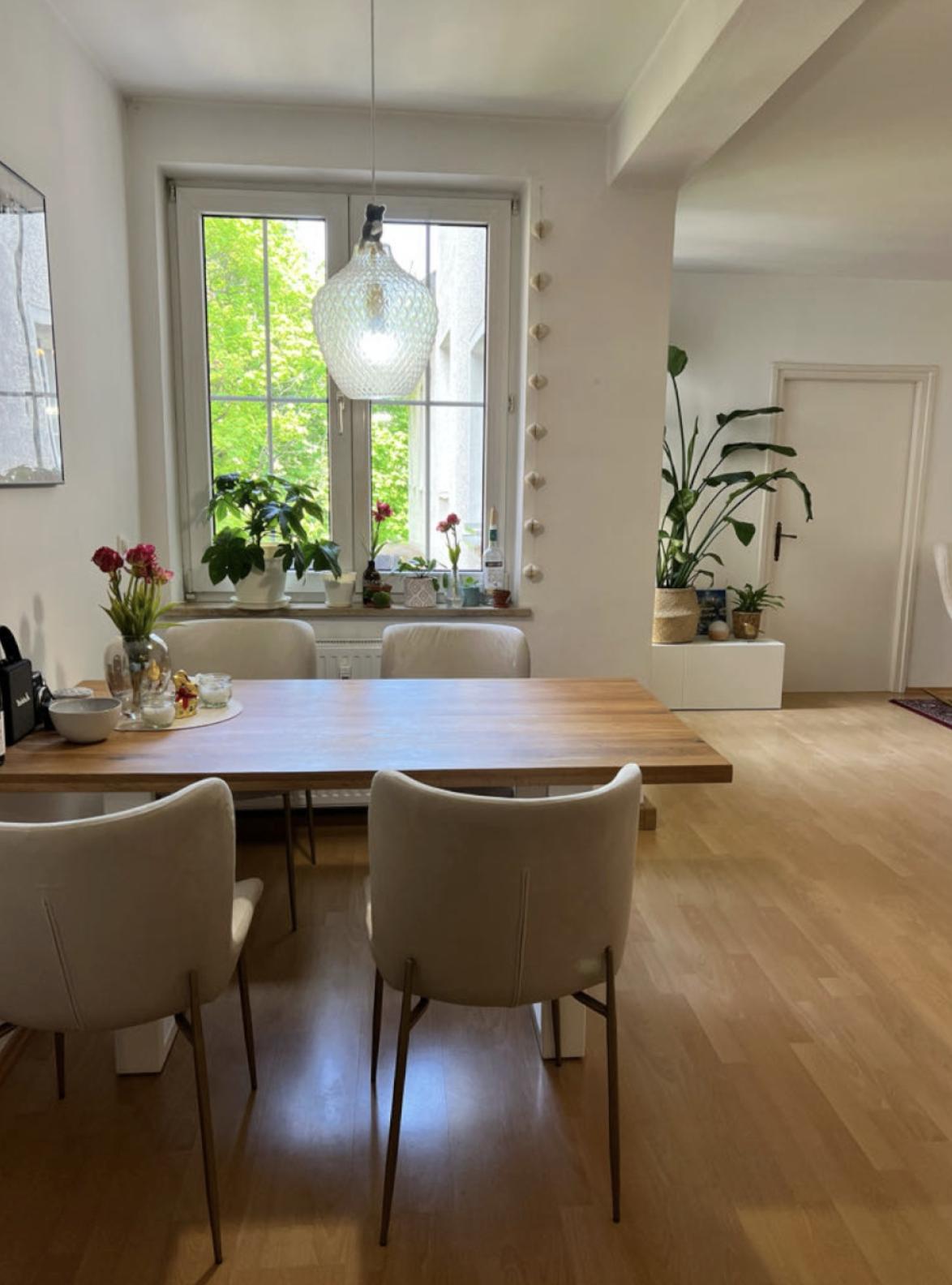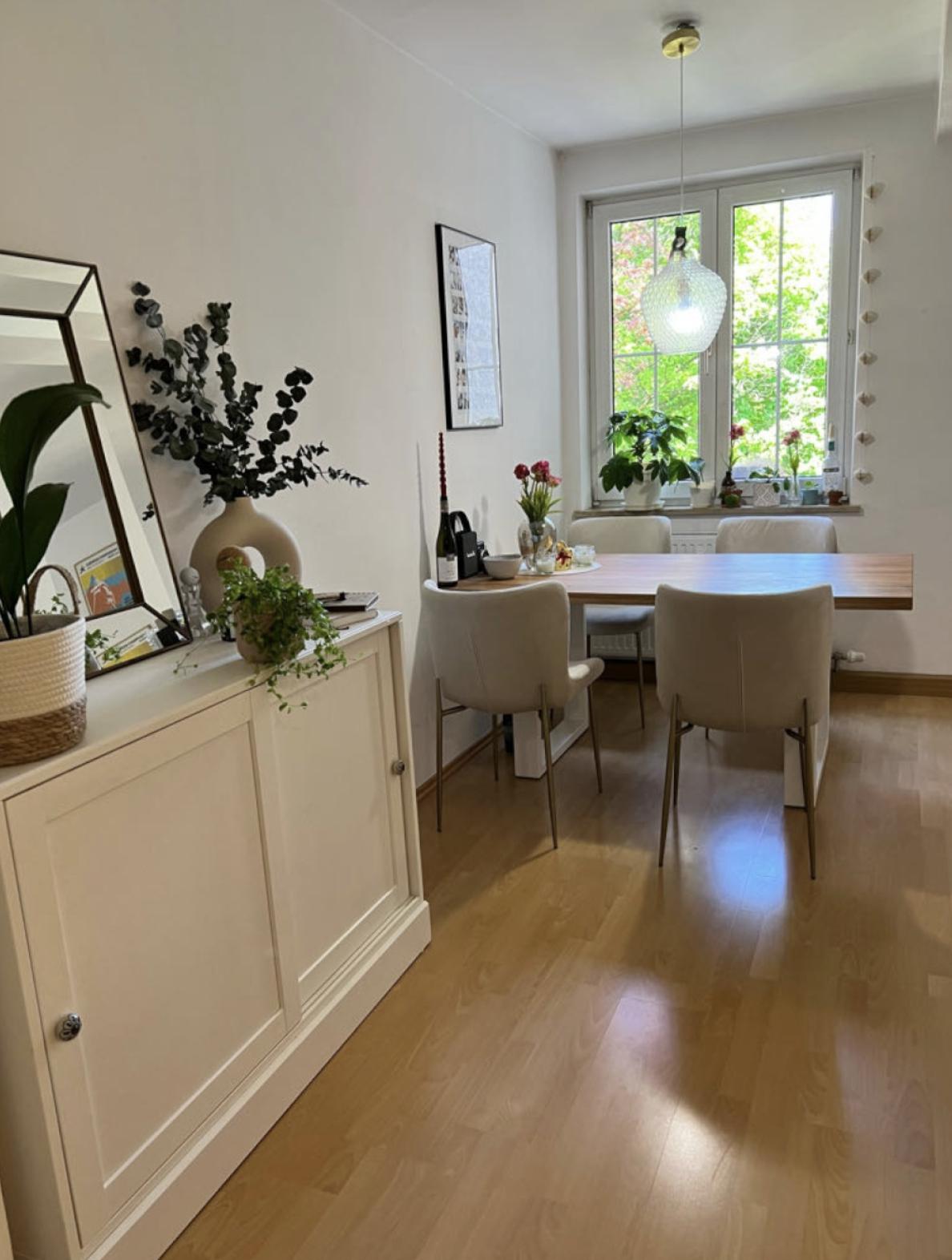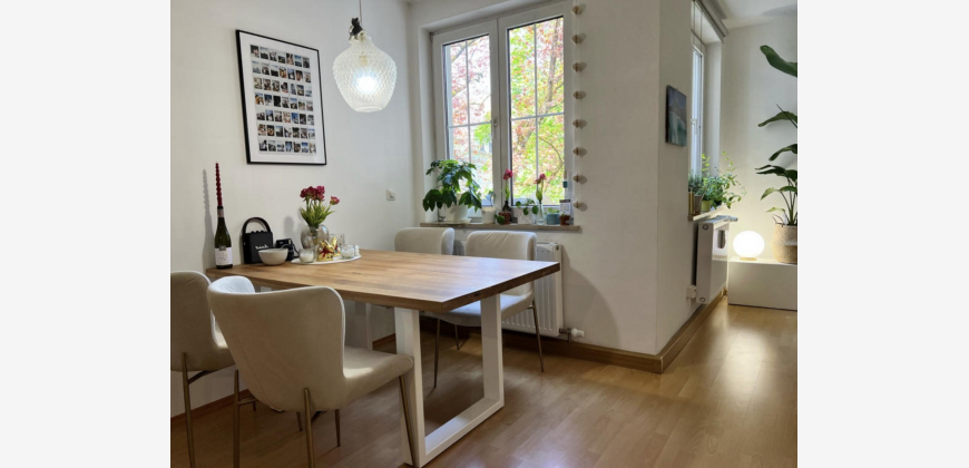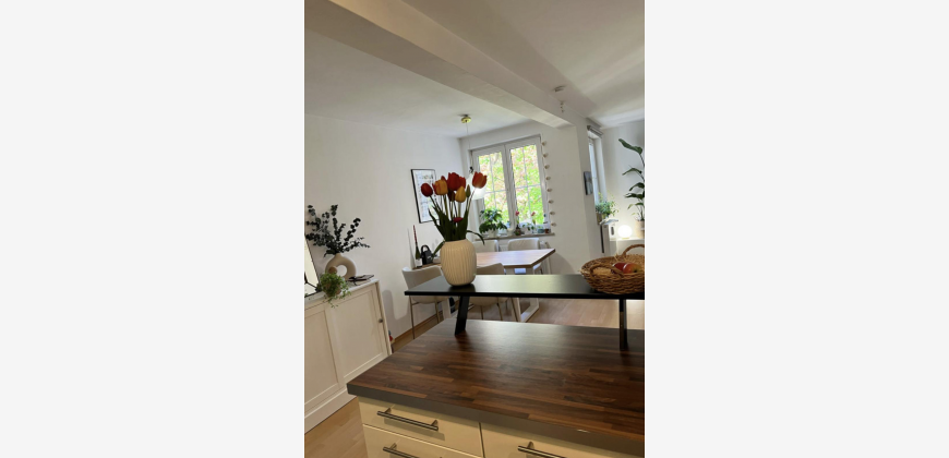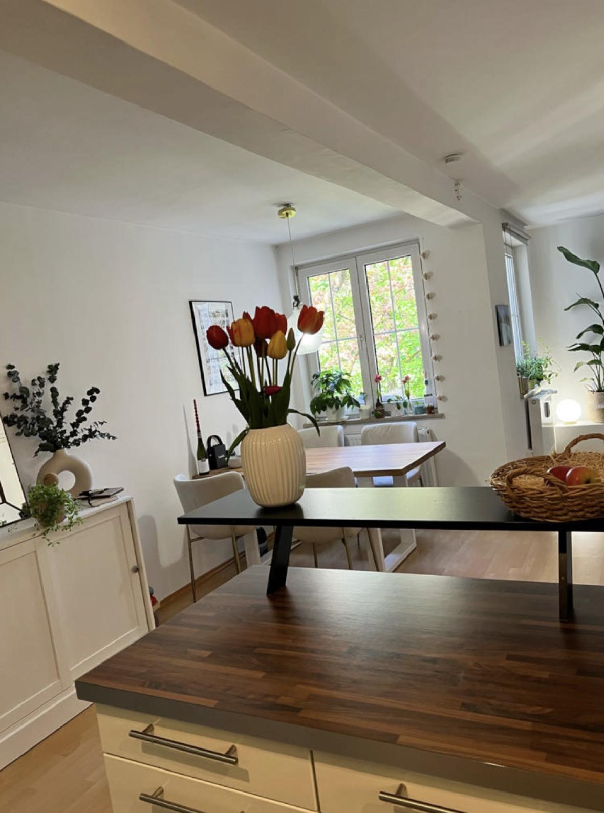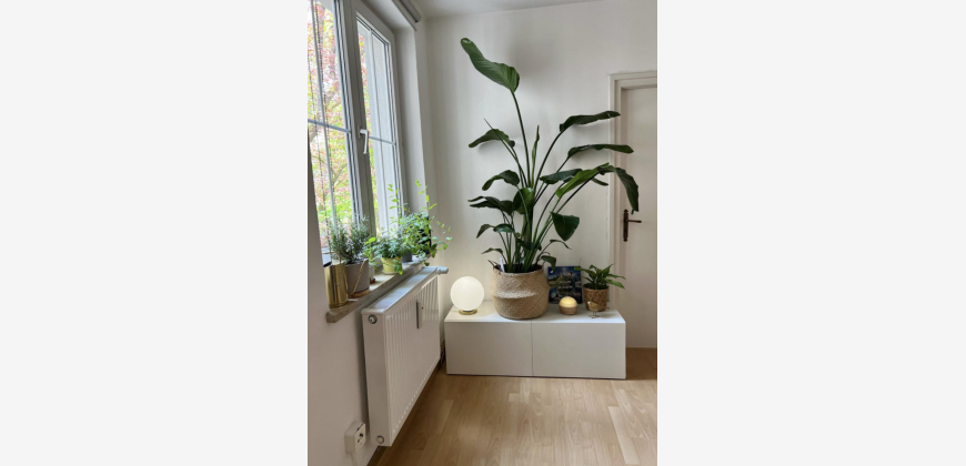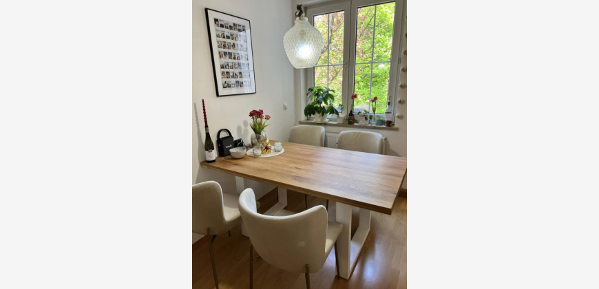 60 Quadratmeter Wohnung im dritten Stock mit Aufzug in einem herrlich renovierten Gebäude mit historischem Charme. Die Wohnung verfügt über zwei Räume und bietet eine äußerst ansprechende Raumaufteilung. Im vorderen Teil der Wohnung befindet sich der Eingangsbereich mit einer kleinen Abstellkammer und einem Schuhschrank. Direkt daneben liegt die Küche, die mit einer großzügigen Arbeitsfläche, einem Elektroherd, einem Backofen sowie einem geräumigen Kühlschrank inklusive drei Gefrierfächern ausgestattet ist. Selbstverständlich steht auch eine Spülmaschine zur Verfügung. Eine Theke fungiert sowohl als zusätzliche Arbeitsfläche als auch als praktische Abgrenzung zum Essbereich. Der Essbereich befindet sich vor einem großen Fenster mit Blick auf den ruhigen Innenhof, der besonders im Frühling und Sommer eine wunderschöne Blütenpracht entfaltet. Er liegt im selben Raum wie die Küche, ist jedoch durch die Theke geschickt abgetrennt. Hier steht ein geschmackvoller Massivholztisch (Eiche, 1,6 Meter lang) mit vier Stühlen. Angrenzend an den Essbereich befindet sich unser Wohnzimmer, das durch die raffinierte Raumaufteilung wie ein separater, abgeschlossener Raum wirkt. Dort kann man es sich auf dem großzügigen Sofa oder dem bequemen Schaukelstuhl gemütlich machen und den Ausblick aus dem Fenster genießen. Das separate Zimmer dient als Schlafzimmer und wird vom geräumigen, 1,80 Meter breiten Boxspringbett dominiert. Des Weiteren befinden sich ein großer Kleiderschrank sowie zwei Kommoden im Raum. Ein großer Ganzkörperspiegel rundet die Ausstattung des Schlafzimmers ab. Zudem haben wir einen Arbeitsbereich eingerichtet, der aus einem höhenverstellbaren Schreibtisch besteht. Das Badezimmer ist ungefähr 5 Quadratmeter groß und verfügt über zwei kleine Fenster. Es ist mit einer geräumigen Badewanne, einem Waschbecken und einer Toilette ausgestattet. Zusätzlich steht eine Waschmaschine zur Verfügung, ein großer Spiegel und ausreichend Stauraum für persönliche Gegenstände sind ebenfalls vorhanden. Die Wohnung ist äußerst ruhig, da alle Fenster zum Innenhof ausgerichtet sind. Besonders im Sommer schätzen wir es sehr, dass sich die Wohnung glücklicherweise nicht übermäßig aufheizt.