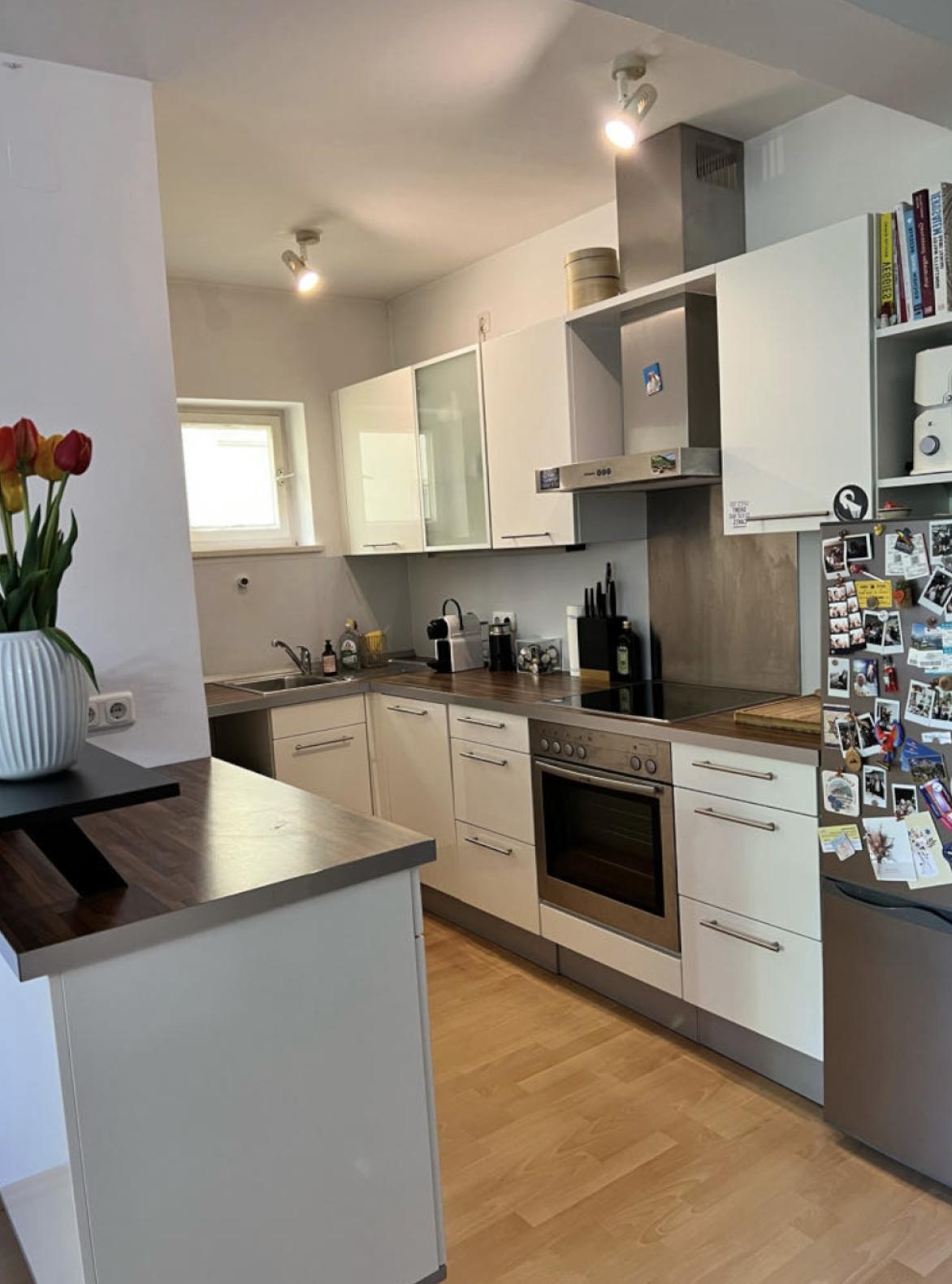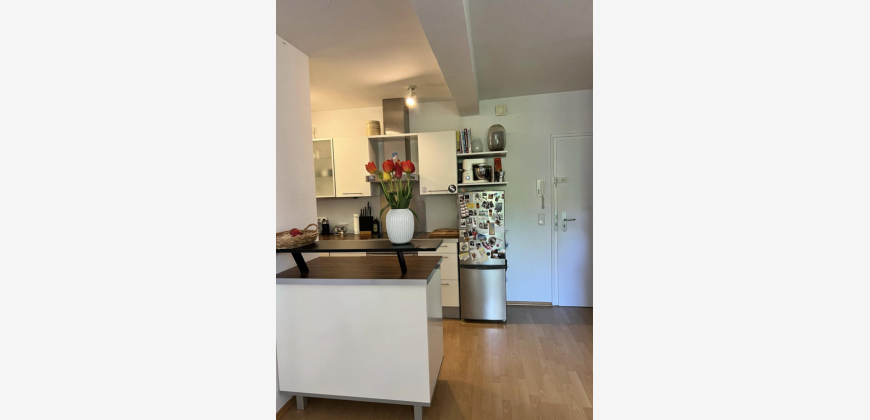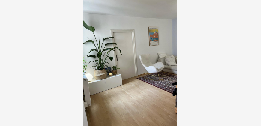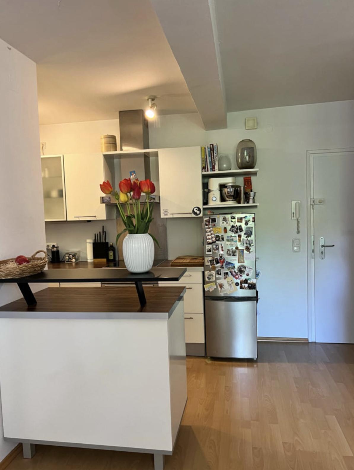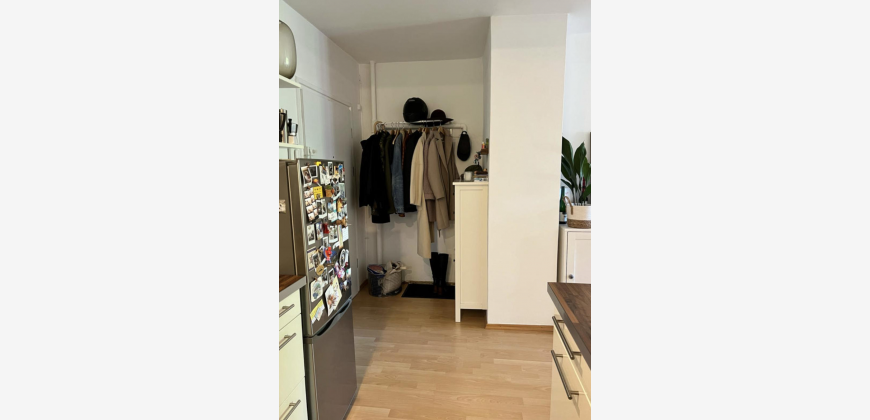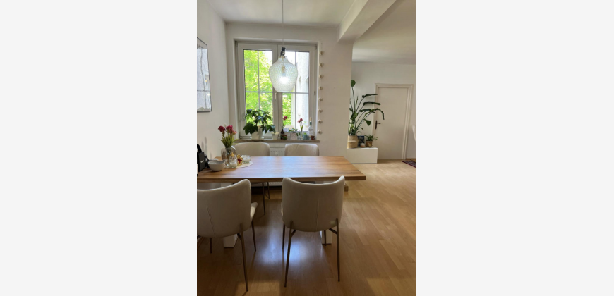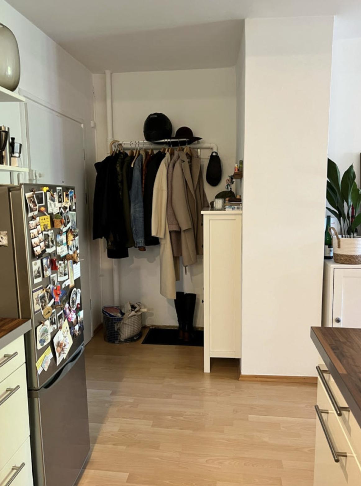 60 Quadratmeter Wohnung im dritten Stock mit Aufzug in einem herrlich renovierten Gebäude mit historischem Charme. Die Wohnung verfügt über zwei Räume und bietet eine äußerst ansprechende Raumaufteilung. Im vorderen Teil der Wohnung befindet sich der Eingangsbereich mit einer kleinen Abstellkammer und einem Schuhschrank. Direkt daneben liegt die Küche, die mit einer großzügigen Arbeitsfläche, einem Elektroherd, einem Backofen sowie einem geräumigen Kühlschrank inklusive drei Gefrierfächern ausgestattet ist. Selbstverständlich steht auch eine Spülmaschine zur Verfügung. Eine Theke fungiert sowohl als zusätzliche Arbeitsfläche als auch als praktische Abgrenzung zum Essbereich. Der Essbereich befindet sich vor einem großen Fenster mit Blick auf den ruhigen Innenhof, der besonders im Frühling und Sommer eine wunderschöne Blütenpracht entfaltet. Er liegt im selben Raum wie die Küche, ist jedoch durch die Theke geschickt abgetrennt. Hier steht ein geschmackvoller Massivholztisch (Eiche, 1,6 Meter lang) mit vier Stühlen. Angrenzend an den Essbereich befindet sich unser Wohnzimmer, das durch die raffinierte Raumaufteilung wie ein separater, abgeschlossener Raum wirkt. Dort kann man es sich auf dem großzügigen Sofa oder dem bequemen Schaukelstuhl gemütlich machen und den Ausblick aus dem Fenster genießen. Das separate Zimmer dient als Schlafzimmer und wird vom geräumigen, 1,80 Meter breiten Boxspringbett dominiert. Des Weiteren befinden sich ein großer Kleiderschrank sowie zwei Kommoden im Raum. Ein großer Ganzkörperspiegel rundet die Ausstattung des Schlafzimmers ab. Zudem haben wir einen Arbeitsbereich eingerichtet, der aus einem höhenverstellbaren Schreibtisch besteht. Das Badezimmer ist ungefähr 5 Quadratmeter groß und verfügt über zwei kleine Fenster. Es ist mit einer geräumigen Badewanne, einem Waschbecken und einer Toilette ausgestattet. Zusätzlich steht eine Waschmaschine zur Verfügung, ein großer Spiegel und ausreichend Stauraum für persönliche Gegenstände sind ebenfalls vorhanden. Die Wohnung ist äußerst ruhig, da alle Fenster zum Innenhof ausgerichtet sind. Besonders im Sommer schätzen wir es sehr, dass sich die Wohnung glücklicherweise nicht übermäßig aufheizt.