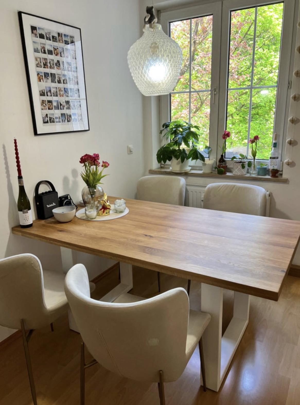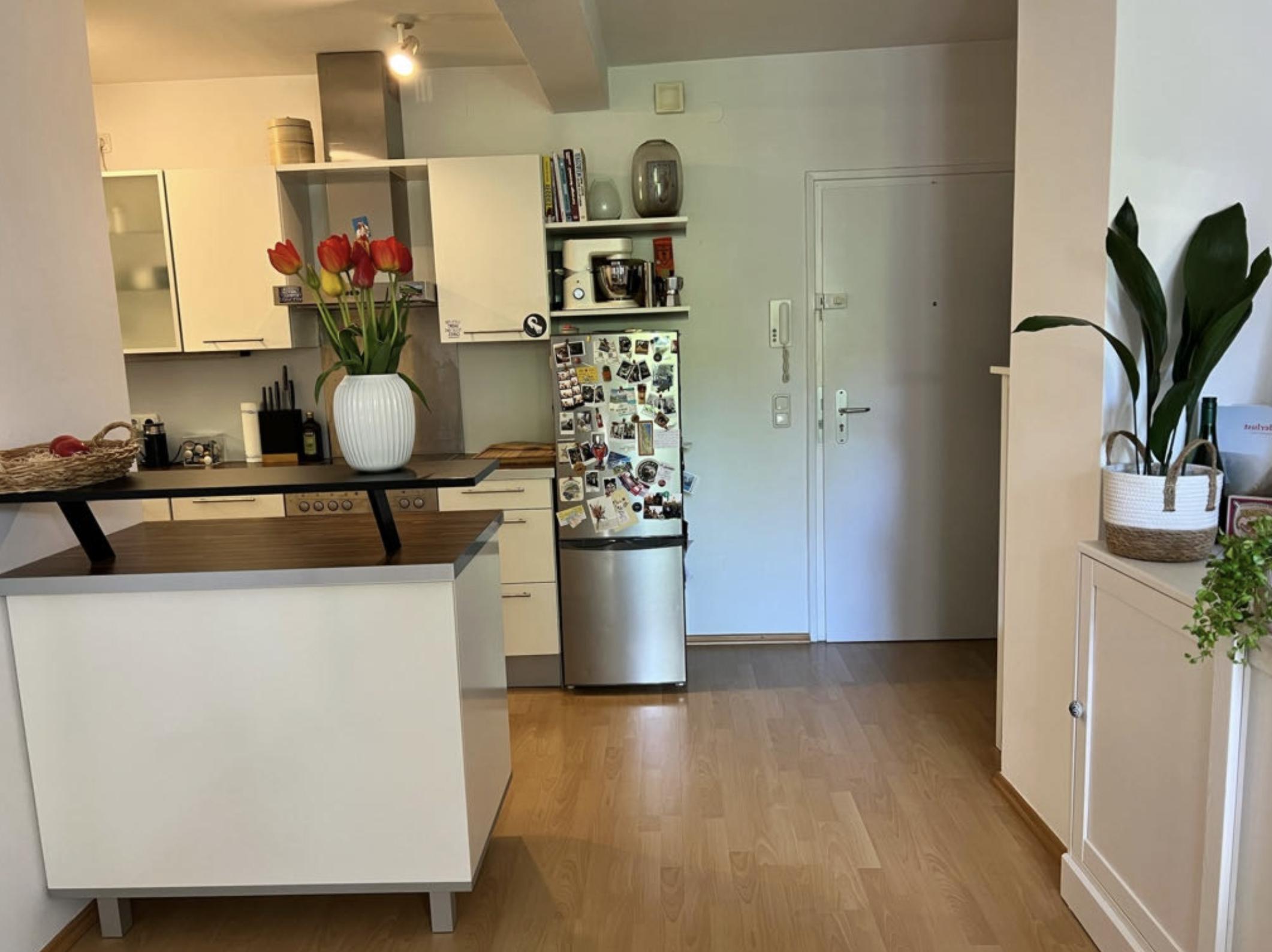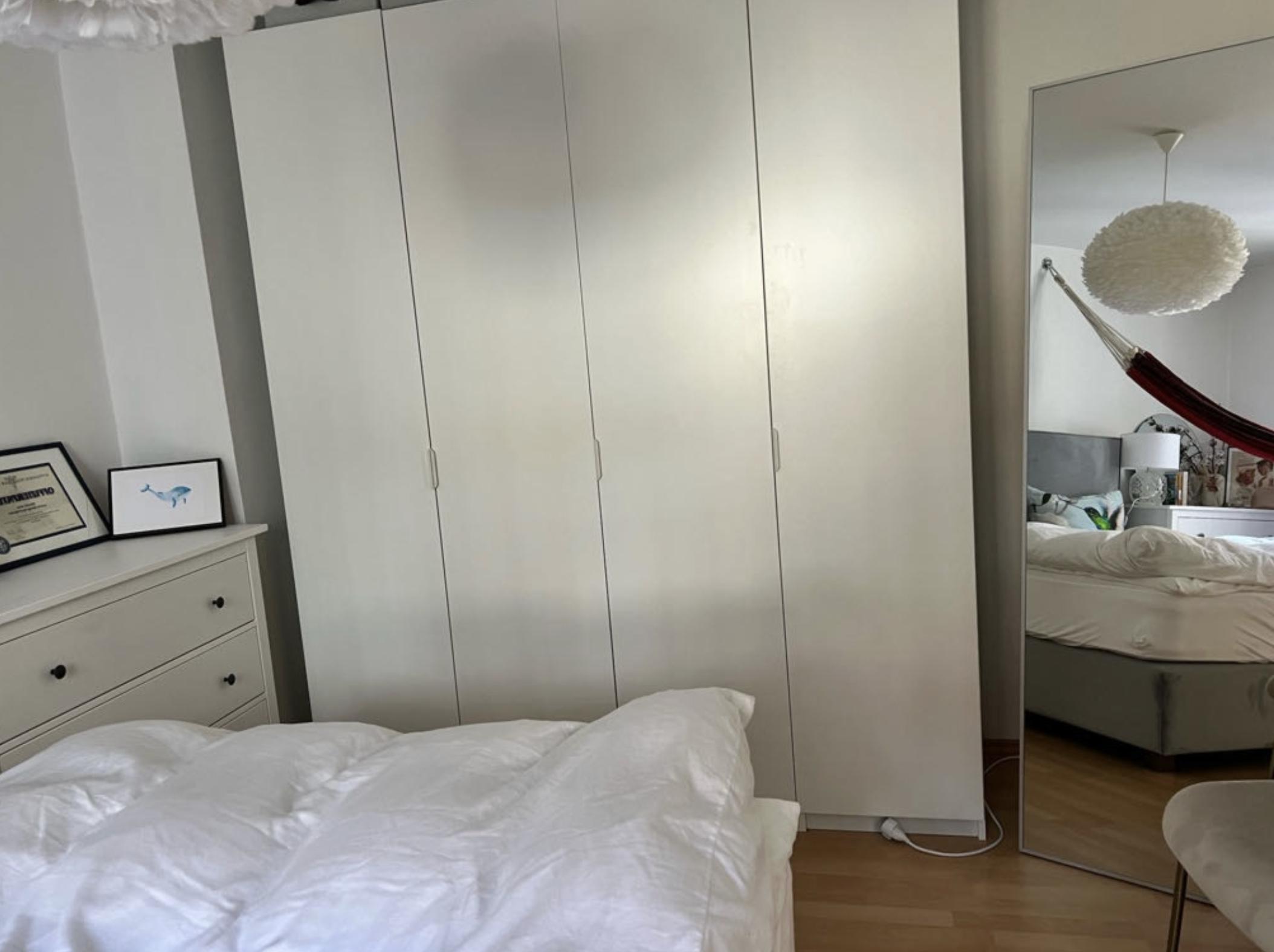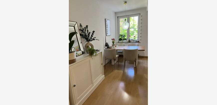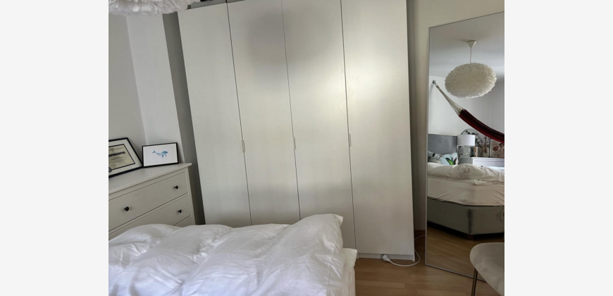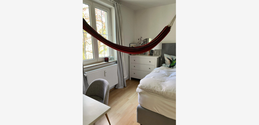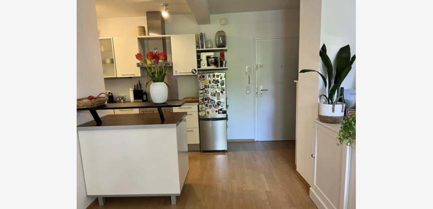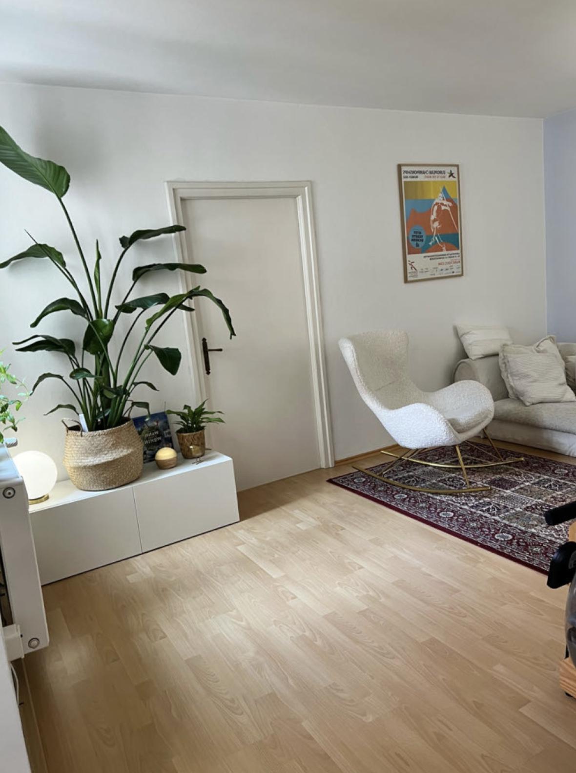60 Quadratmeter Wohnung im dritten Stock mit Aufzug in einem herrlich renovierten Gebäude mit historischem Charme. Die Wohnung verfügt über zwei Räume und bietet eine äußerst ansprechende Raumaufteilung. Im vorderen Teil der Wohnung befindet sich der Eingangsbereich mit einer kleinen Abstellkammer und einem Schuhschrank. Direkt daneben liegt die Küche, die mit einer großzügigen Arbeitsfläche, einem Elektroherd, einem Backofen sowie einem geräumigen Kühlschrank inklusive drei Gefrierfächern ausgestattet ist. Selbstverständlich steht auch eine Spülmaschine zur Verfügung. Eine Theke fungiert sowohl als zusätzliche Arbeitsfläche als auch als praktische Abgrenzung zum Essbereich. Der Essbereich befindet sich vor einem großen Fenster mit Blick auf den ruhigen Innenhof, der besonders im Frühling und Sommer eine wunderschöne Blütenpracht entfaltet. Er liegt im selben Raum wie die Küche, ist jedoch durch die Theke geschickt abgetrennt. Hier steht ein geschmackvoller Massivholztisch (Eiche, 1,6 Meter lang) mit vier Stühlen. Angrenzend an den Essbereich befindet sich unser Wohnzimmer, das durch die raffinierte Raumaufteilung wie ein separater, abgeschlossener Raum wirkt. Dort kann man es sich auf dem großzügigen Sofa oder dem bequemen Schaukelstuhl gemütlich machen und den Ausblick aus dem Fenster genießen. Das separate Zimmer dient als Schlafzimmer und wird vom geräumigen, 1,80 Meter breiten Boxspringbett dominiert. Des Weiteren befinden sich ein großer Kleiderschrank sowie zwei Kommoden im Raum. Ein großer Ganzkörperspiegel rundet die Ausstattung des Schlafzimmers ab. Zudem haben wir einen Arbeitsbereich eingerichtet, der aus einem höhenverstellbaren Schreibtisch besteht. Das Badezimmer ist ungefähr 5 Quadratmeter groß und verfügt über zwei kleine Fenster. Es ist mit einer geräumigen Badewanne, einem Waschbecken und einer Toilette ausgestattet. Zusätzlich steht eine Waschmaschine zur Verfügung, ein großer Spiegel und ausreichend Stauraum für persönliche Gegenstände sind ebenfalls vorhanden. Die Wohnung ist äußerst ruhig, da alle Fenster zum Innenhof ausgerichtet sind. Besonders im Sommer schätzen wir es sehr, dass sich die Wohnung glücklicherweise nicht übermäßig aufheizt.
