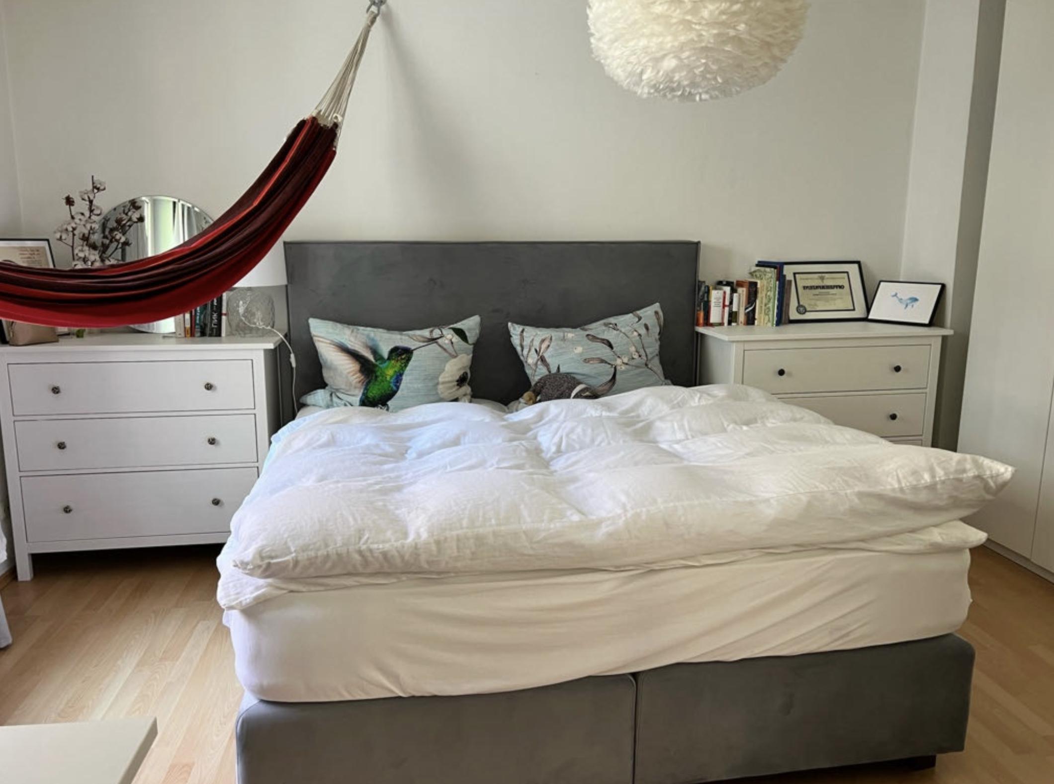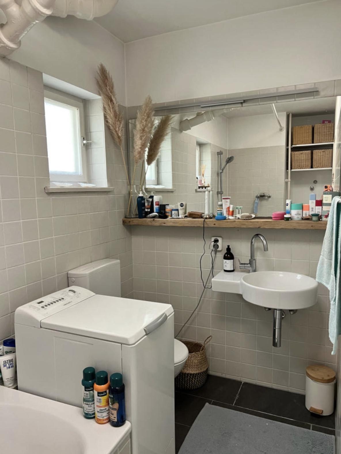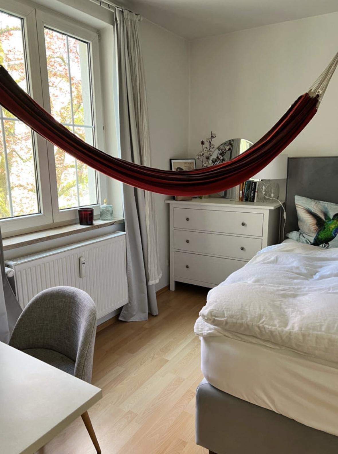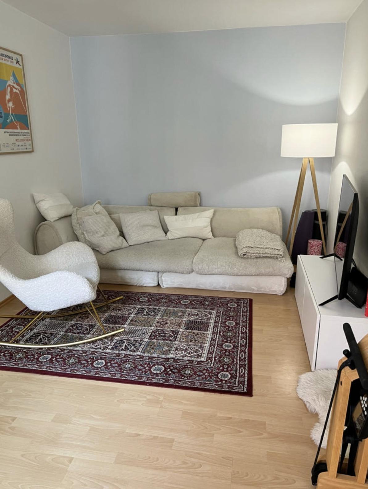 60 Quadratmeter Wohnung im dritten Stock mit Aufzug in einem herrlich renovierten Gebäude mit historischem Charme. Die Wohnung verfügt über zwei Räume und bietet eine äußerst ansprechende Raumaufteilung. Im vorderen Teil der Wohnung befindet sich der Eingangsbereich mit einer kleinen Abstellkammer und einem Schuhschrank. Direkt daneben liegt die Küche, die mit einer großzügigen Arbeitsfläche, einem Elektroherd, einem Backofen sowie einem geräumigen Kühlschrank inklusive drei Gefrierfächern ausgestattet ist. Selbstverständlich steht auch eine Spülmaschine zur Verfügung. Eine Theke fungiert sowohl als zusätzliche Arbeitsfläche als auch als praktische Abgrenzung zum Essbereich. Der Essbereich befindet sich vor einem großen Fenster mit Blick auf den ruhigen Innenhof, der besonders im Frühling und Sommer eine wunderschöne Blütenpracht entfaltet. Er liegt im selben Raum wie die Küche, ist jedoch durch die Theke geschickt abgetrennt. Hier steht ein geschmackvoller Massivholztisch (Eiche, 1,6 Meter lang) mit vier Stühlen. Angrenzend an den Essbereich befindet sich unser Wohnzimmer, das durch die raffinierte Raumaufteilung wie ein separater, abgeschlossener Raum wirkt. Dort kann man es sich auf dem großzügigen Sofa oder dem bequemen Schaukelstuhl gemütlich machen und den Ausblick aus dem Fenster genießen. Das separate Zimmer dient als Schlafzimmer und wird vom geräumigen, 1,80 Meter breiten Boxspringbett dominiert. Des Weiteren befinden sich ein großer Kleiderschrank sowie zwei Kommoden im Raum. Ein großer Ganzkörperspiegel rundet die Ausstattung des Schlafzimmers ab. Zudem haben wir einen Arbeitsbereich eingerichtet, der aus einem höhenverstellbaren Schreibtisch besteht. Das Badezimmer ist ungefähr 5 Quadratmeter groß und verfügt über zwei kleine Fenster. Es ist mit einer geräumigen Badewanne, einem Waschbecken und einer Toilette ausgestattet. Zusätzlich steht eine Waschmaschine zur Verfügung, ein großer Spiegel und ausreichend Stauraum für persönliche Gegenstände sind ebenfalls vorhanden. Die Wohnung ist äußerst ruhig, da alle Fenster zum Innenhof ausgerichtet sind. Besonders im Sommer schätzen wir es sehr, dass sich die Wohnung glücklicherweise nicht übermäßig aufheizt.
