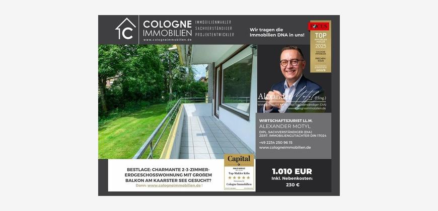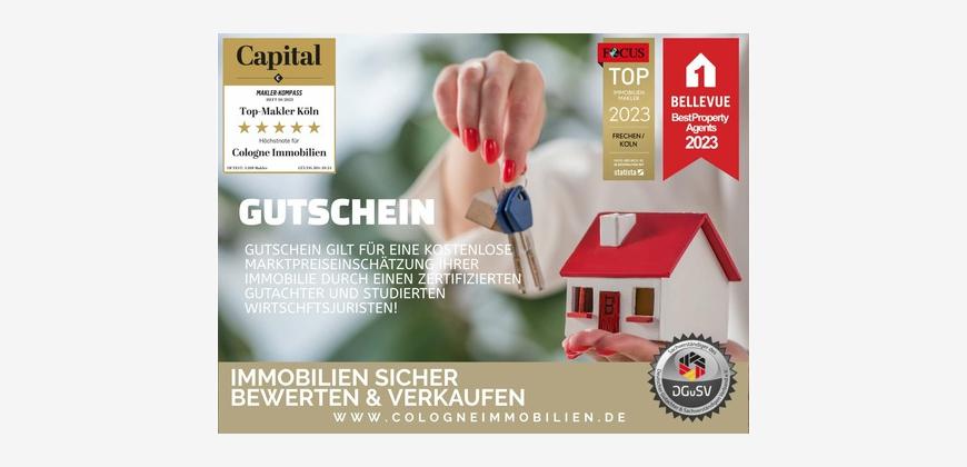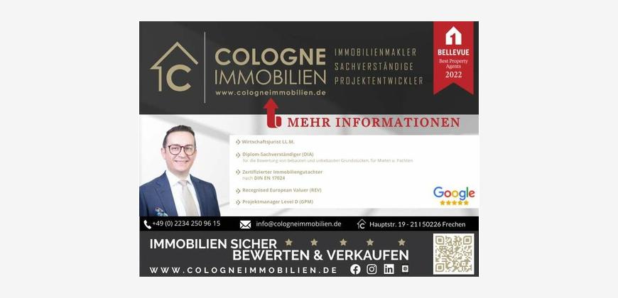 Menschen & Immobilien - Wir beweisen, dass Immobilienvermarktung durch uns anders geht! COLOGNE IMMOBILIEN (Sachverständigenbüro u. Immobilienmakler) wurde im Jahre 2023 und 2024 zum BELLEVUE BEST PROPERTY AGENTS ausgezeichnet. Damit gehören wir zu den besten Immobilienunternehmen weltweit, empfohlen von BELLEVUE - Europas größtem Immobilien-Magazin. Auch die Zeitschrift FOCUS zeichnete uns 2023, 2024 und 2025 zum TOP 1.000-Maklerunternehmen-Deutschlands aus!