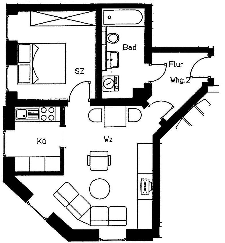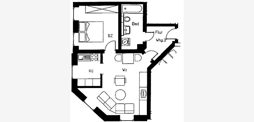 Diese Hochparterre-Wohnung umfasst zwei Zimmer mit praktischer Raumaufteilung und moderner Ausstattung sowie Laminatböden. Die separate Küche bietet ausreichend Platz für Möbel und Geräte. Im Badezimmer ist eine Badewanne installiert. Zusätzlicher Stauraum wird in einem seperaten Abstellraum im Keller bereitgestellt.Lage