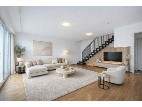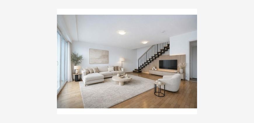 Die 4-Zimmer-Wohnung erstreckt sich über zwei Ebenen und vermittelt bereits beim Betreten ein beeindruckendes Raumgefühl. Der offen gestaltete Wohn- und Essbereich auf der unteren Ebene überzeugt durch seine Großzügigkeit und Helligkeit. Große Fensterflächen lassen viel Tageslicht herein und schaffen eine freundliche, einladende Atmosphäre. Direkt anschließend öffnet sich die weitläufige Terrasse mit schönem Blick in den begrünten Innenbereich der umliegenden Gebäude – ein wunderbarer Ort für entspannte Stunden im Freien oder gesellige Abende mit Familie und Freunden.