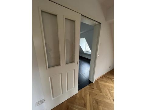 - Kassettentür mit Glaseinsätzen als Schiebeelement zwischen Essbereich und Küche