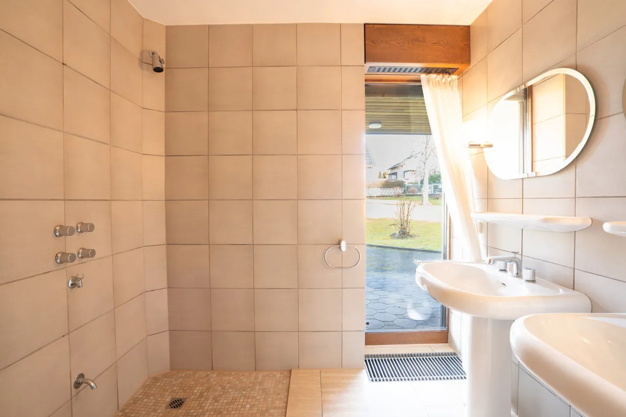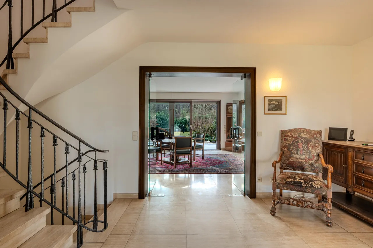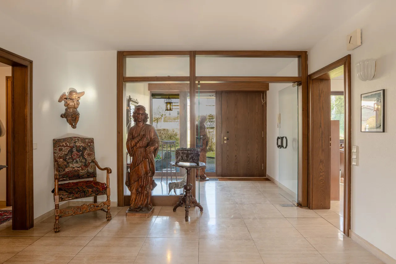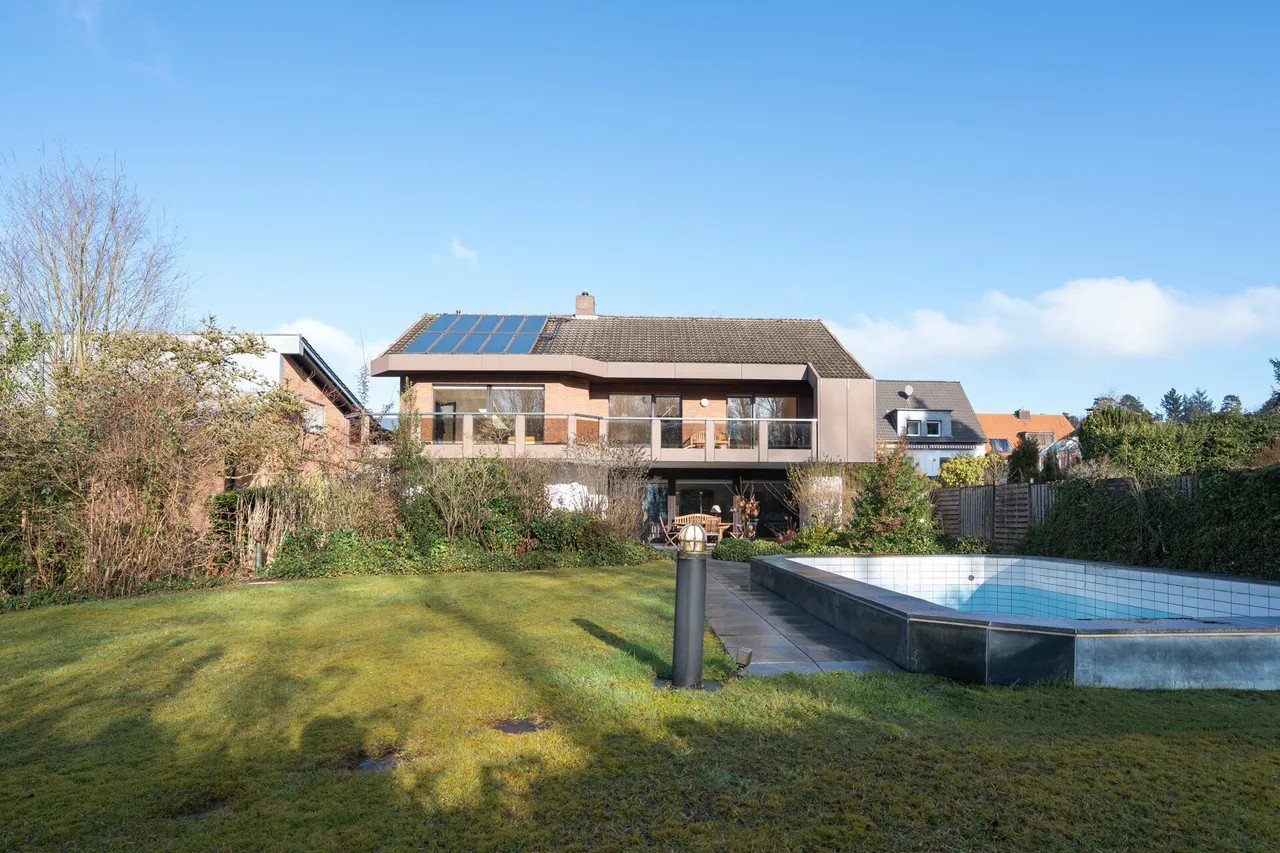 Bei Betreten des Hauses empfängt Sie eine großzügige Eingangsdiele mit Windfang, die einen einladenden ersten Eindruck hinterlässt. Der großzügige Wohn-/Essbereich von 63 m² begeistert durch bodentiefe Fenster, die einen stufenlosen Übergang zum liebevoll angelegten Garten bieten. Hier genießen Sie einen idyllischen Blick in den angrenzenden Wald. Die teilüberdachte Terrasse führt zum beheizten Außenpool, dessen Temperatur optimal durch Sonnenkollektoren reguliert wird.