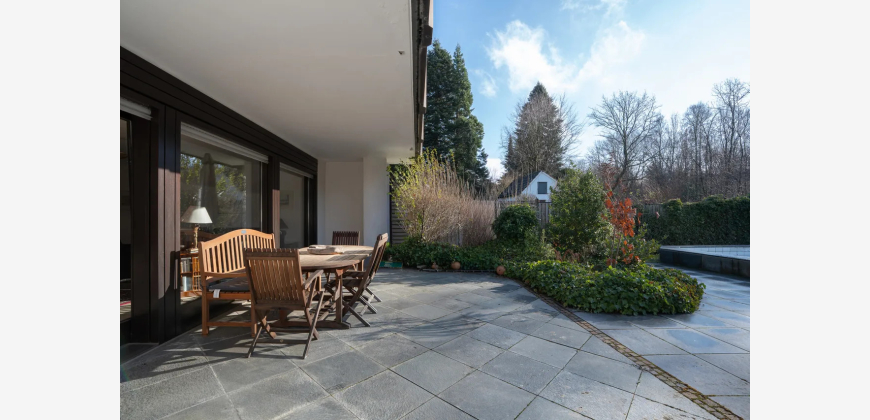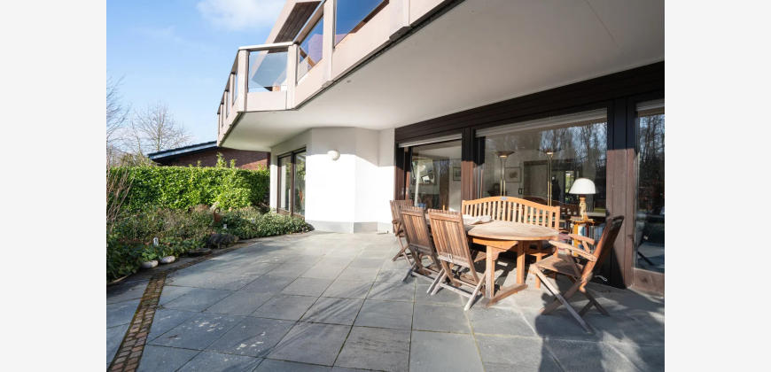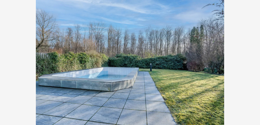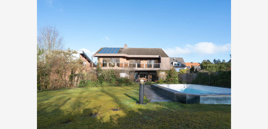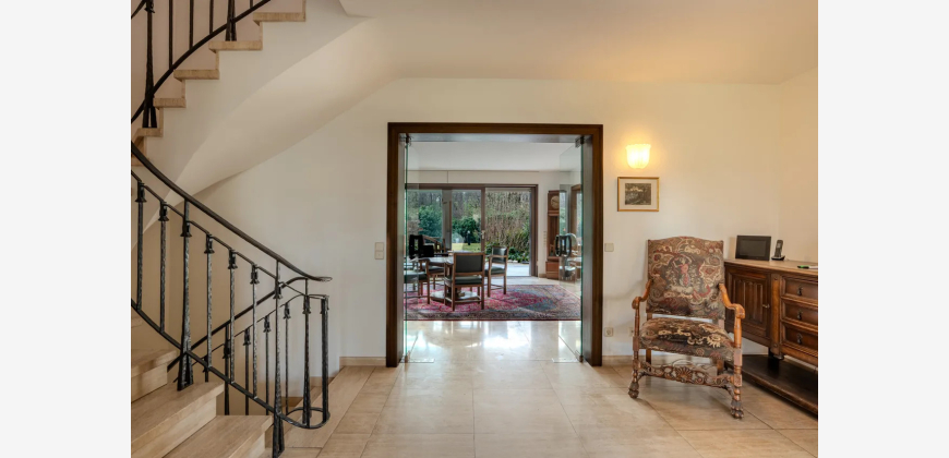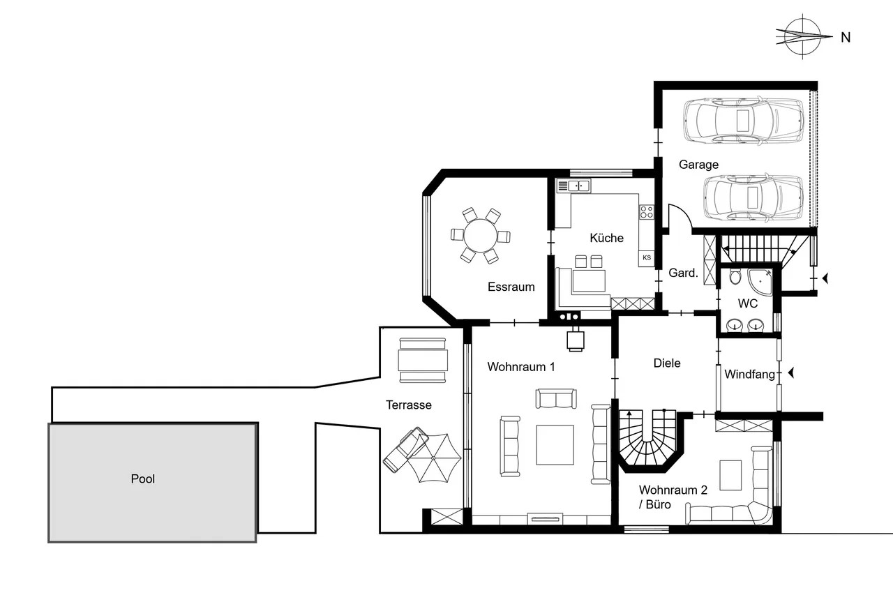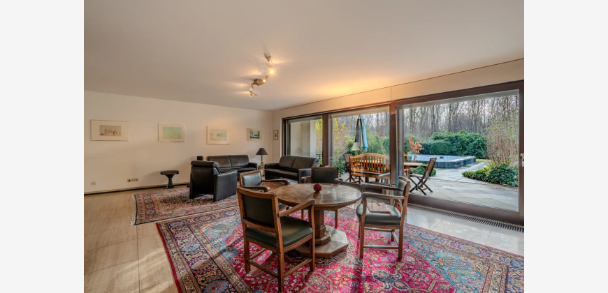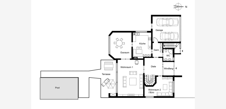 Bei Betreten des Hauses empfängt Sie eine großzügige Eingangsdiele mit Windfang, die einen einladenden ersten Eindruck hinterlässt. Der großzügige Wohn-/Essbereich von 63 m² begeistert durch bodentiefe Fenster, die einen stufenlosen Übergang zum liebevoll angelegten Garten bieten. Hier genießen Sie einen idyllischen Blick in den angrenzenden Wald. Die teilüberdachte Terrasse führt zum beheizten Außenpool, dessen Temperatur optimal durch Sonnenkollektoren reguliert wird.