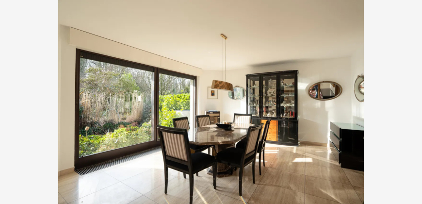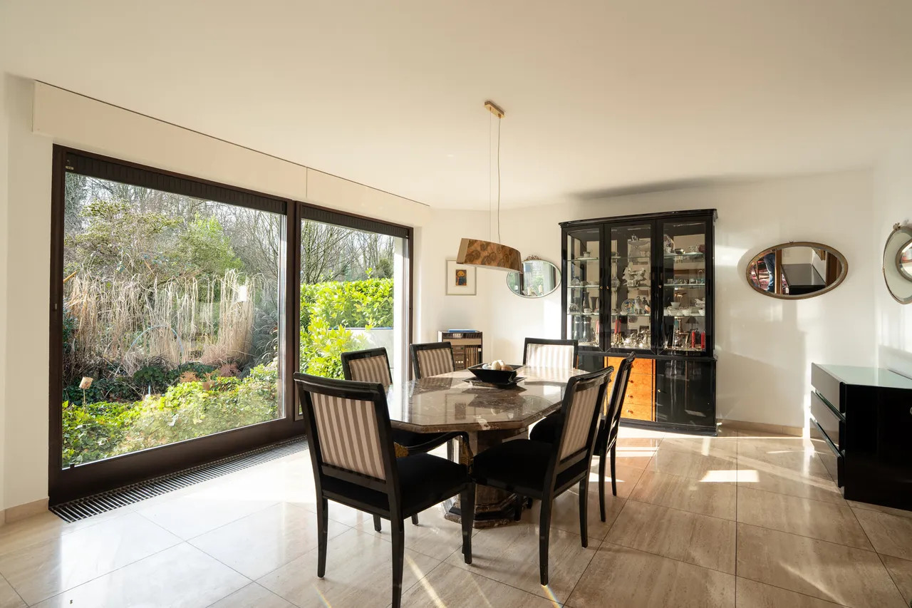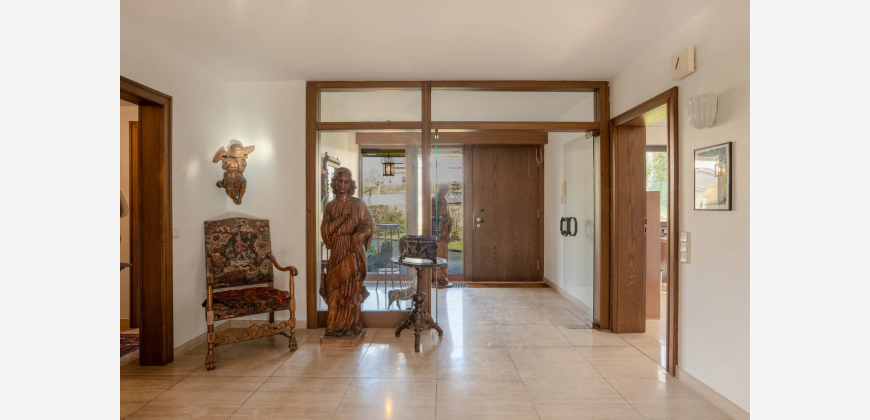 Das Obergeschoss bietet fünf Zimmer und drei fensterreiche Bäder sowie einen Balkon, der sich über die gesamte Rückseite des Hauses erstreckt. Er bietet einen tollen Blick in den Garten und auf den Pool. Bei Nutzung der Einliegerwohnung, stehen ein Elternschlafzimmer mit Vorraum und En-Suite-Badezimmer sowie zwei weitere Schlafräume mit Duschbad zur Verfügung.