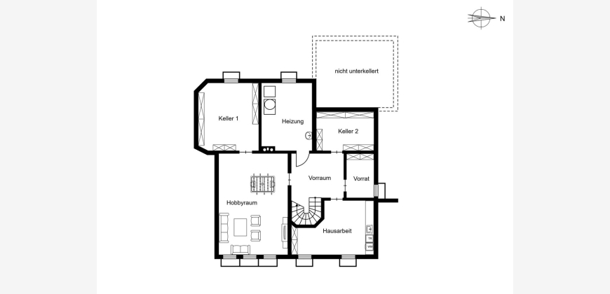 Der vollunterkellerte Bereich umfasst sechs Räume, inklusive eines Hobbyraums, Vorratsraums und weiterer flexibel nutzbarer Flächen. Die Zentralheizung aus dem Jahr 2008 arbeitet mit Gas als Energieträger.