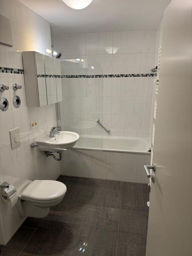 Im Wohn- und Essbereich sorgt ein zeitloser Buchenholzboden für eine freundliche Atmosphäre. Bad und Flur sind mit einem pflegeleichten, anthrazitfarbenen Granitboden ausgestattet. Das Badezimmer ist in klassischem Weiß gehalten und wirkt hell und aufgeräumt.
