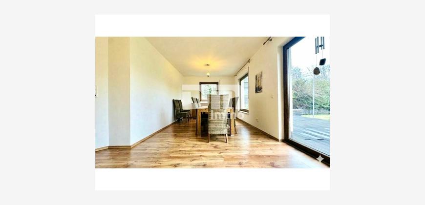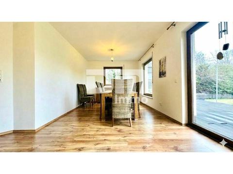 Der Lebensmittelpunkt des Hauses ist das großzügige Wohn- und Esszimmer im EG, das durch helle Laminatböden und direkten Zugang zur Sonnenterrasse eine einladende Atmosphäre schafft.