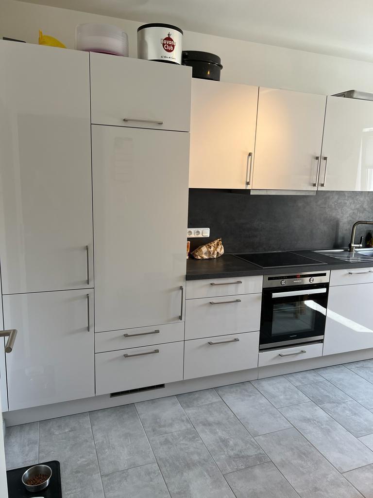 - Luxuriöse Einbauküche in brillanten Fronten mit Grafit-Arbeitsplatte