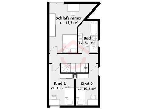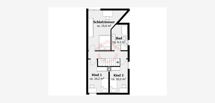 Im Obergeschoss schlafen und entspannen Sie. Aktuell finden Sie hier zwei sehr großzügige Zimmer und das zeitlos weiß geflieste Tageslichtbad mit Wanne und Dusche. Der Clou für Familien oder Home-Office-Nutzer: Der Grundriss ist flexibel! Das riesige Zimmer bestand ursprünglich aus zwei einzelnen Räumen. Da Fenster und Türen noch an der richtigen Stelle sitzen, können Sie mit minimalem Aufwand (eine einfache Trockenbauwand) den Ursprungszustand wiederherstellen. So wird aus der jetzigen großzügigen 3-Zimmer-Variante im Handumdrehen eine 4-Zimmer-Wohnung mit zwei Kinderzimmern.