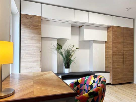 •Schlafcouch, Schreibtisch, Einbauschränke, Regale und Lampen