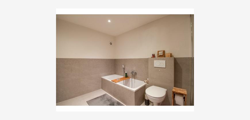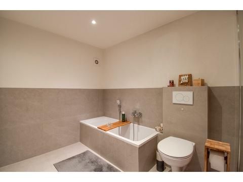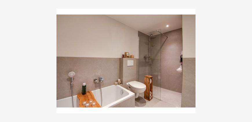 Das hochwertig ausgestattete, neue Badezimmer verfügt über eine bodengleiche Dusche, eine Badewanne sowie eine angenehme Fußbodenheizung. Ergänzt wird das Raumangebot durch ein separates Gäste-WC sowie einen großzügigen Abstellraum mit Waschmaschinenanschluss innerhalb der Wohnung.