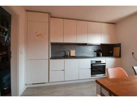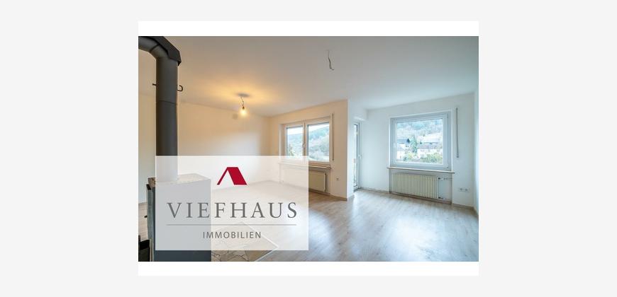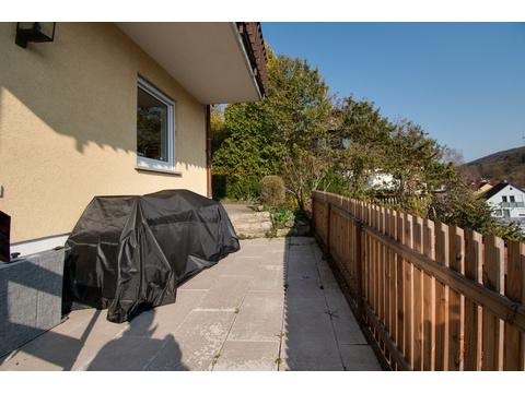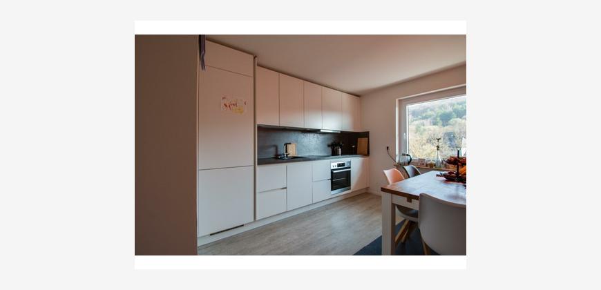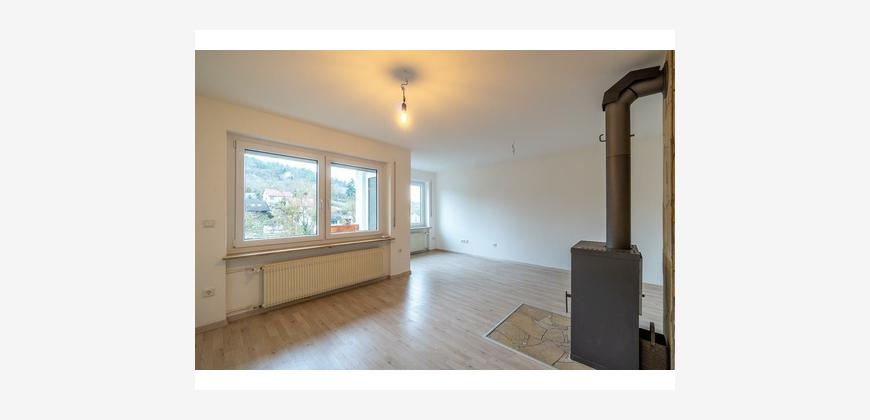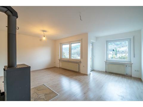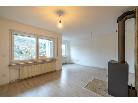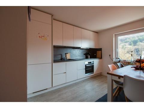 Das Herzstück der Wohnung ist das großzügige Wohnzimmer mit Holzofen, welches durch große Fensterflächen lichtdurchflutet ist und direkten Zugang zur sonnigen Terrasse (ca. 15 m²) bietet – ideal für entspannte Stunden im Freien.