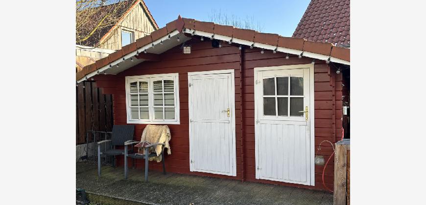 Im Außenbereich erwarten Sie ein PKW-Abstellplatz, eine Blockhütte für Fahrräder sowie ein großes Blockhaus mit zwei Räumen – ideal als Werkstatt, Hobbyraum, Stauraum oder Gartenbüro.