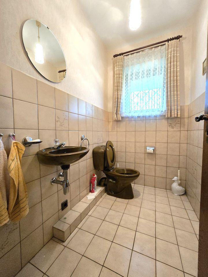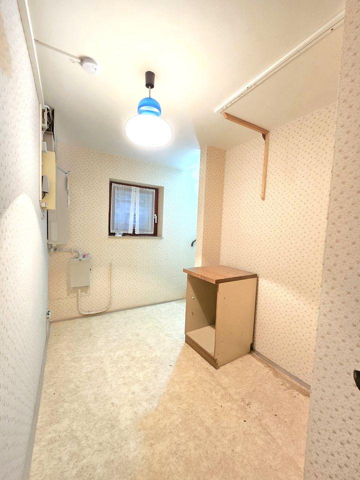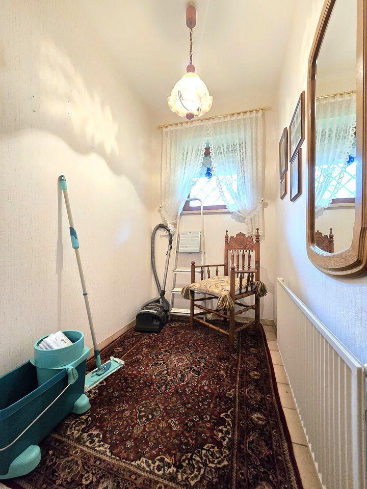 Fenster und eine Balkontür in den Giebelseiten, Dachfenster und eine Dämmung mit Mineralwolle zwischen den Sparren sind bereits installiert. Fehlt nur noch der Trockenausbau. Der Winkelbungalow ist voll unterkellert. Alle Kellerräume sind mit Heizkörpern ausgestattet. Somit bietet sich eine vielfältige Nutzung der Kellerräume. Der Vorbesitzer richtete sich hier einen Partyraum, einen Bügelraum und eine Werkstatt ein. Zusätzlich finden Sie einen Vorratsraum, einen Heizungsraum mit Platz für Waschmaschine und Trockner, sowie ein WC mit kleinem Handwaschbecken.
