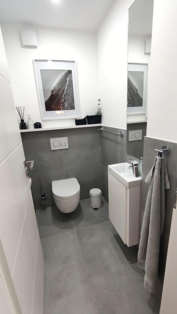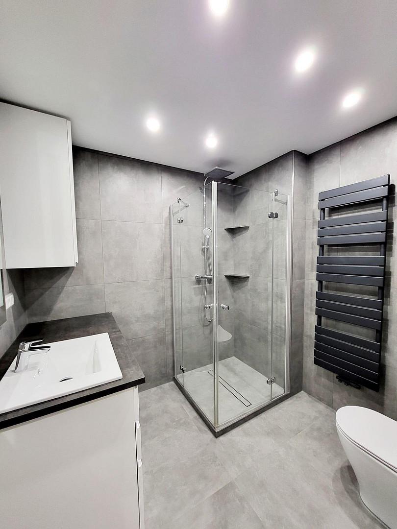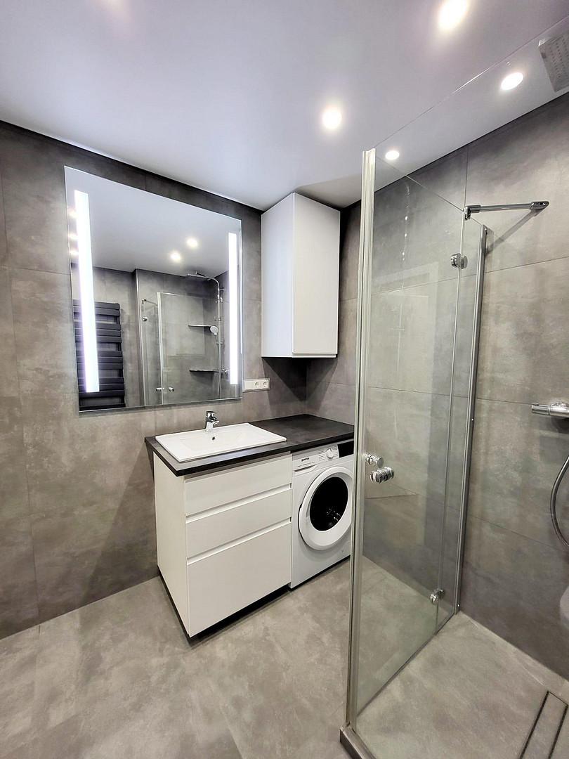Der WC-Bereich verfügt über eine begehbare Dusche mit Glaswand, einen Unterschrank, einen Wandschrank und eine Waschmaschine-Trockner-Kombination.