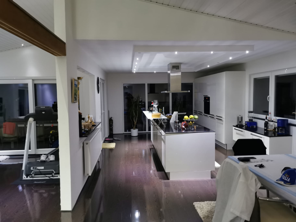 Die Küche ist eine PlanA Markenküche in Hochglanzweiss mit Granitplatte und Markengeräten (Miele/Constructa etc.).