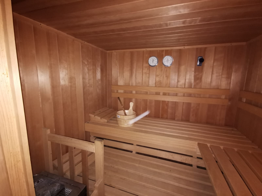 Badezimmer EG: Dusche, WC, Waschbecken, Zugang zur Sauna