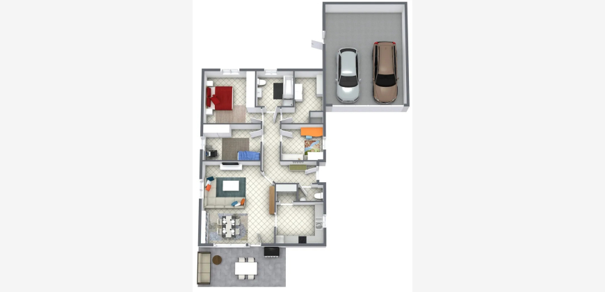 Ein besonderes Highlight ist die großzügige, ca. 44,7 m² große Doppelgarage mit Satteldach. Sie ist gefliest, verfügt über ein elektrisch betriebenes Tor, einen Wasseranschluss sowie einen direkten Zugang in den rückwärtigen Gartenbereich. Zusätzlich stehen zwei Stellplätze unmittelbar vor der Garage sowie zwei weitere gepflasterte Stellflächen in der Einfahrt zur Verfügung.