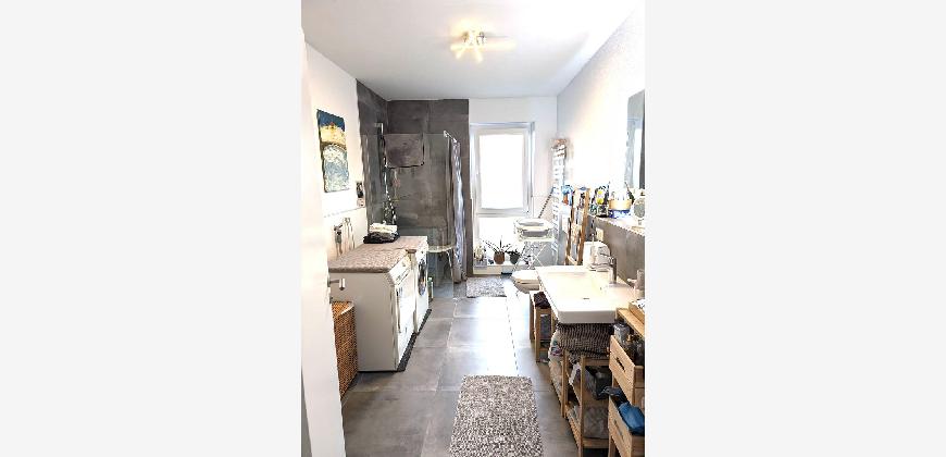 Im gefliesten Bad befindet sich eine durch eine Glasabtrennung getrennte bodengleiche Dusche; Anschlüsse für Waschmaschine und Trockner sind vorhanden. Die Badausstattung ist gehoben.