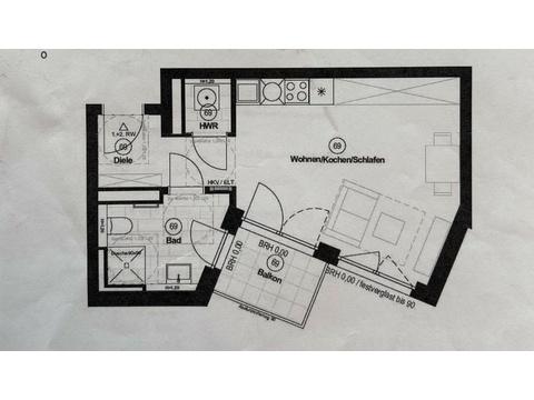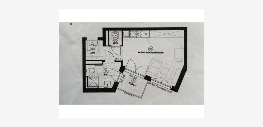Auf ca. 36,9 m² Wohnfläche erwartet Sie ein heller und offener Wohn-, Koch- und Schlafbereich, der durch große Fensterflächen lichtdurchflutet ist und eine angenehme Wohnatmosphäre schafft. Der direkte Zugang zum Balkon erweitert den Wohnraum und lädt zum Entspannen ein.
