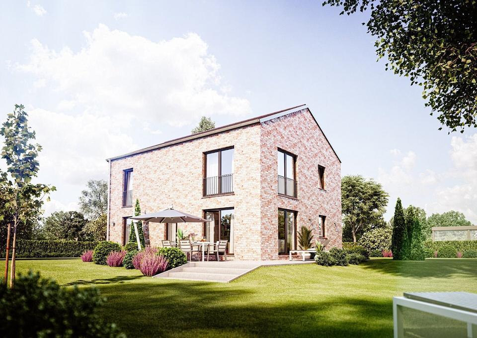 Das Wichtigste für Sie ist eine solide Basis auf der Sie bauen können? Unser Calvus 630 kommt mit allem was Sie brauchen. Jeder Raum hat seine Funktion: Ein großer Wohnraum für gemütliches Beisammen sein, eine separate Küche, die Kochaktivitäten für sich bleiben lässt und ein extra Zimmer für Gäste oder als Heimbüro. Im oberen Stockwerk ist Platz für drei etwa gleichgroße Räume. Aus insgesamt 150 qm Wohnfläche lässt sich einiges machen. Klingt das nach einem Eigenheim für Sie? Wir sichern Sie mit Bauherrenschutzbrief ab und beraten Sie zu jeder Zeit. Gemeinsam setzen wir Ihre Wohnträume in die Tat um. Die Abbildung zeigt eine Ausstattungsvariante. Heinz von Heiden baut das zweigeschossige Einfamilienhaus Calvus 630 sowohl mit Putzfassade als auch mit Verblendern für Sie.