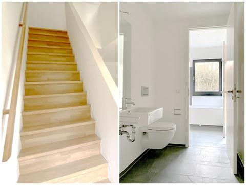 Die Wohnung erstreckt sich über das Erd- und 1. Obergeschoss. Der Eingang befindet sich im 1. Obergeschoss, von wo aus Sie direkt in die offen gestaltete, moderne Küche mit angrenzendem Balkon sowie den Essbereich gelangen. Über den Flur erreichen Sie das Schlafzimmer, das ebenfalls mit einem Balkon ausgestattet ist. Das WC mit angrenzendem Duschbad ist sowohl vom Flur als auch direkt vom Schlafzimmer aus zugänglich. Ein praktischer Abstellraum rundet das Raumangebot auf dieser Ebene ab. Die Küche kann auf Wunsch vom Vormieter übernommen werden.