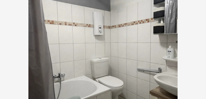 Das Badezimmer ist mit Wanne, Waschtisch und WC ausgestattet. Zusätzlich steht ein Gäste-WC mit Waschtisch und WC sowie Platz für Waschmaschine und Trockner zur Verfügung. Die Warmwasserversorgung erfolgt dezentral.