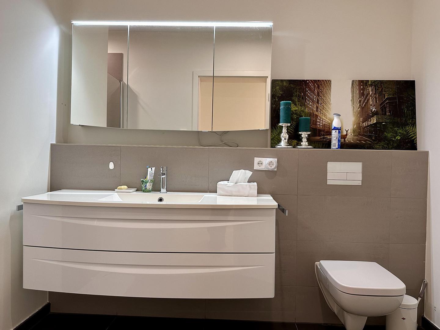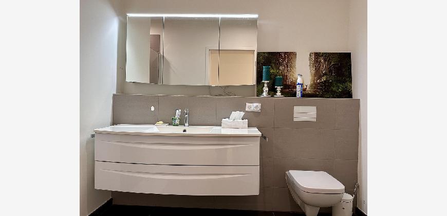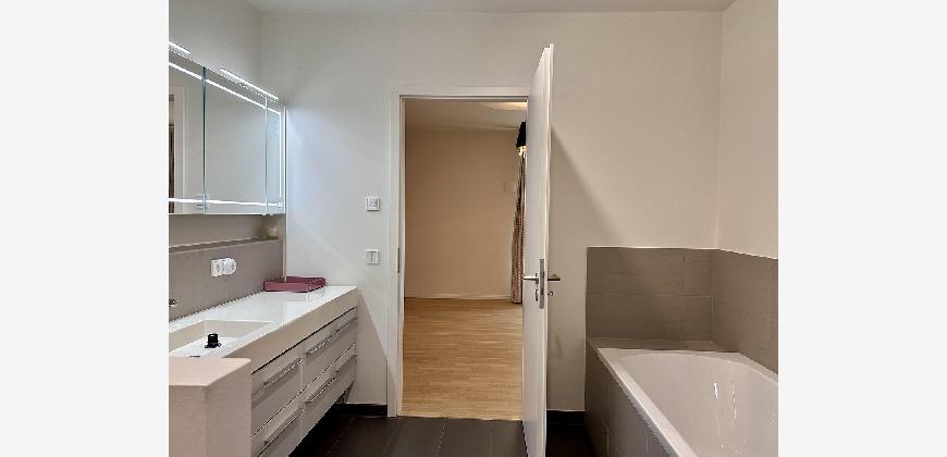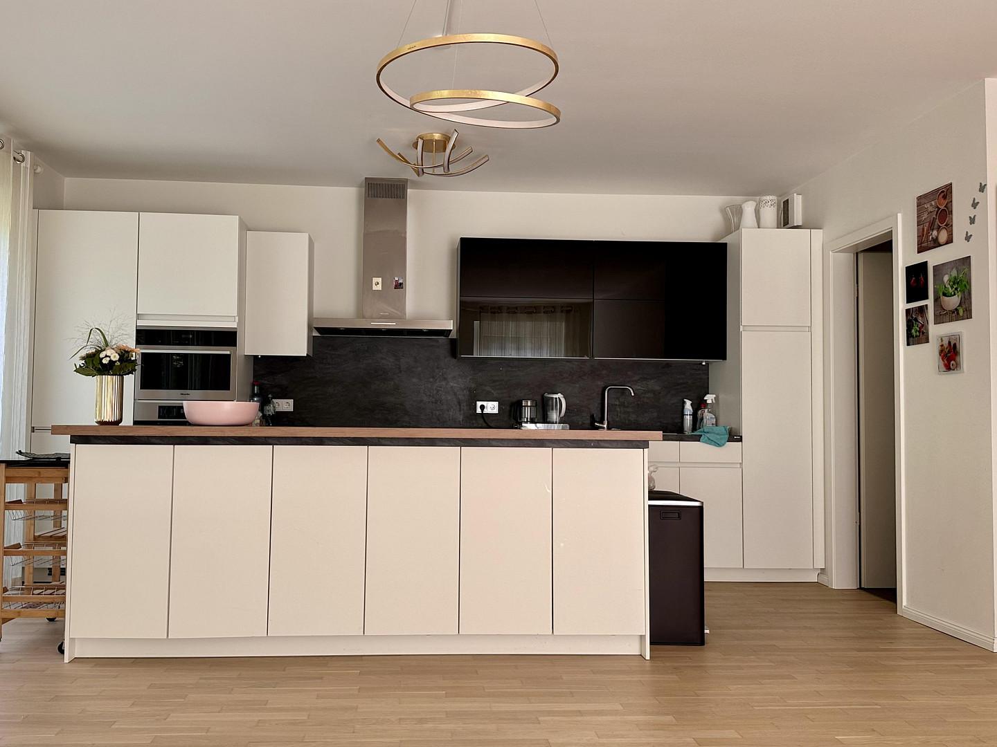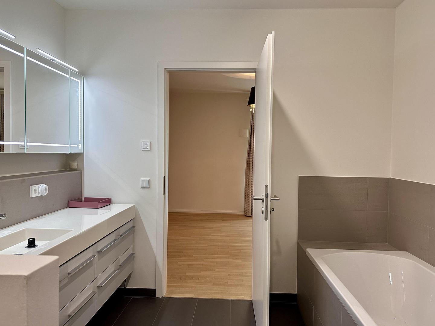 Die Wohnung ist hochwertig ausgestattet: Parkettboden, Fußbodenheizung in allen Räumen, Einbauküche mit Miele-Geräten, Badezimmer mit Bademöbeln, Spiegelschrank mit Beleuchtung.