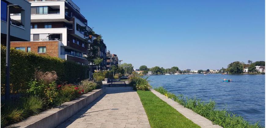Das 2,5-Zimmer-Penthouse gehört zum Helling Hof und liegt im Wohnquartier 52° Nord. Es bietet eine faszinierende Sicht auf die Wasserlandschaft der Dahme. Die bodentiefen Fenster lassen viel natürliches Licht herein. Die großzügige von der Sonne verwöhnte Dachterrasse mit 50 m² bietet viel Platz für entspannende Stunden im Freien, Feiern mit Familie und Freunden oder das schönste Homeoffice der Stadt. Neben dem geräumigen Wohn- und Essbereich hat das Schlafzimmer über ein zusätzliches halbes Zimmer Platz für eine Umkleide oder einen Arbeitsbereich. Dieser Bereich könnte vom Schlafzimmer räumlich getrennt werden, sodass ein separates drittes Zimmer geschaffen wird. Der Eingangsbereich sieht eine große Garderobe vor. Zusammen mit einem Hauswirtschaftsraum und dem Keller ist damit ausreichend Stauraum vorhanden.