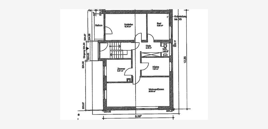 Die Wohnung ist aufgeteilt in ein großes Wohnzimmer mit Essbereich, einer zum Teil möblierten Küche, 1 Schlafzimmer, 1 Kinderzimmer, 1 modernisierten Bad mit ebenerdiger Dusche und einer Badewanne sowie einem separaten Gäste-WC.