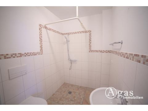 Das Badezimmer ist modern gefliest und verfügt über eine ebenerdige Dusche.