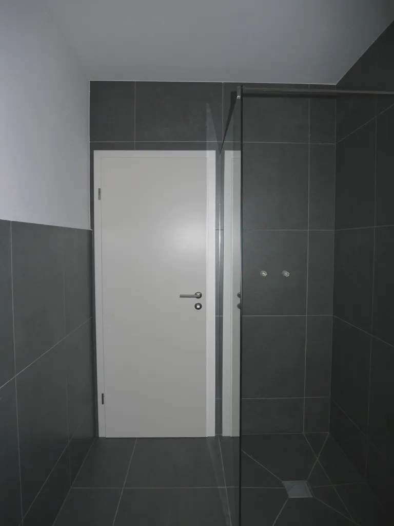 Das Badezimmer ist dunkel gefliest und mit einer Dusche sowie Fenster ausgestattet.