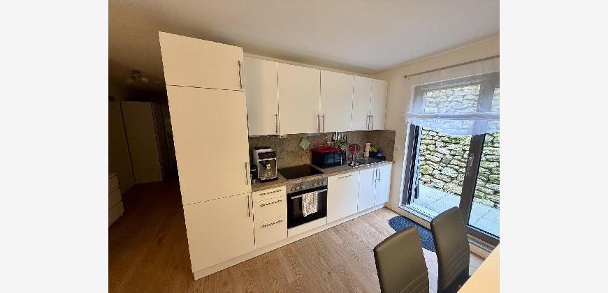 Moderne 2-Zimmer-Souterrainwohnung (Bj. 2023) in einem 3-Parteien-Haus mit ca. 7,50 m² Lichthof, Fußbodenheizung und Wärmepumpe (Energieeffizienzklasse A+), Einbauküche inkl. Elektrogeräte im Mietpreis enthalten, Glasfaseranschluss, Fahrradabstellplätze im Hof sowie optional anmietbarer PKW-Stellplatz.