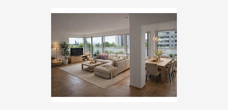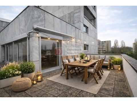 Skylineblick bei Tag. Lichtermeer bei Nacht. Und eine große Süd-West Dachterrasse, wie man sie in Frankfurt nur selten findet.