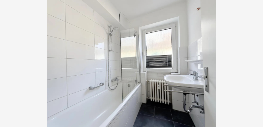 Ein kleiner Flur führt Sie von der Küche aus zu Ihrem Schlafzimmer und einem Tageslichtbad. Das Badezimmer verfügt über ein Fenster, ein Waschbecken und eine Badewanne mit Duschabtrennung. Vom Schlafzimmer aus gelangen Sie auf den zweiten Balkon, welcher ebenfalls süd-westlich ausgerichtet ist und einen tollen Blick in die darunterliegenden Gärten bietet.