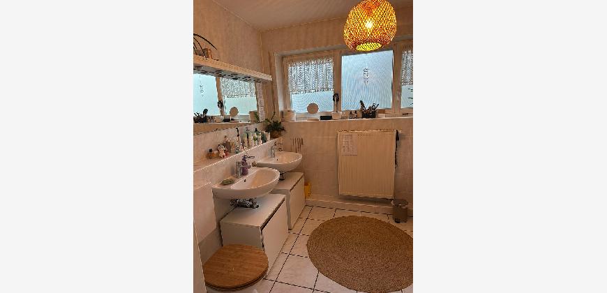 Wenn man die Wohnung betritt, dann steht man direkt in einem geräumigen Flur. Hier ist genügend Platz um eine Garderobe oder einen großen Schrank zu platzieren. Im Anschluss befindet sich der großzügig gestaltete Wohn- und Essbereich. Von hier aus gelangen zu Ihrer Terrasse mit Blick ins Grüne. Auf der anderen Seite des Zimmers befindet sich der Essbereich und direkt neben an die geflieste Küche. Im hinteren Teil der Wohnung ist links und rechts jeweils ein Zimmer. Das Bad ist perfekt aufgestattet mit zwei Waschbecken, einer Badewanne, einer Duschkabine und lässt keine Wünsche offen. Ihr Waschmaschinen- und Ablufttrocknerstellplatz befindet sich in einer separaten Waschküche außerhalb der Wohnung. Abgerundet wird das Angebot durch die beiden PKW-Stellplätze die bereits im Mietpreis enthalten sind. Auf Wunsch kann die Einbauküche vom Vormieter abgelöst werden.