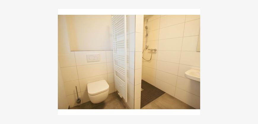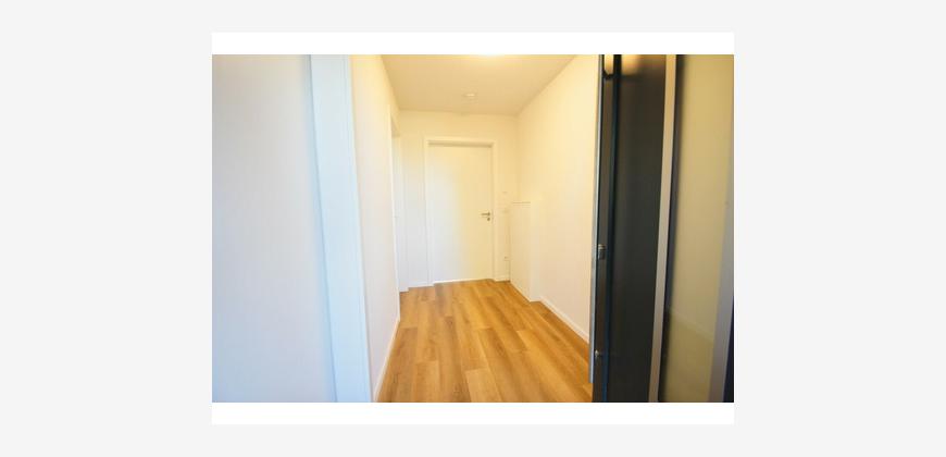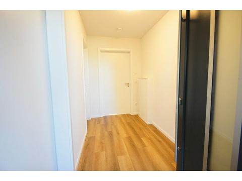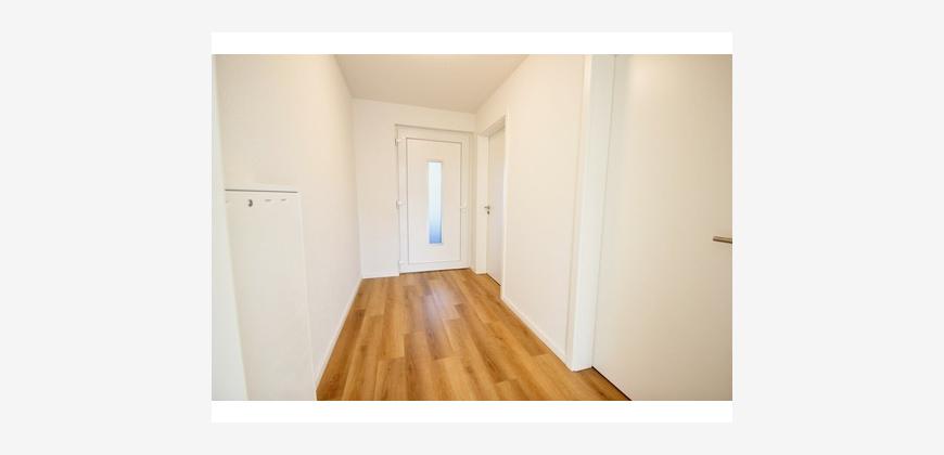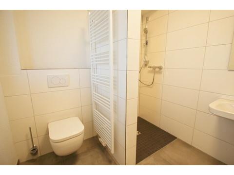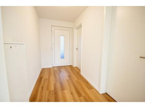 Im Inneren empfängt ein praktisches Entree mit ausreichend Platz für Garderobe und Stauraum. Das Tageslichtbad ist modern ausgestattet und verfügt über eine Dusche, ein WC, einen Waschtisch sowie einen Handtuchheizkörper. Ein separater Hauswirtschaftsraum bietet Anschlüsse für Waschmaschine und Trockner.