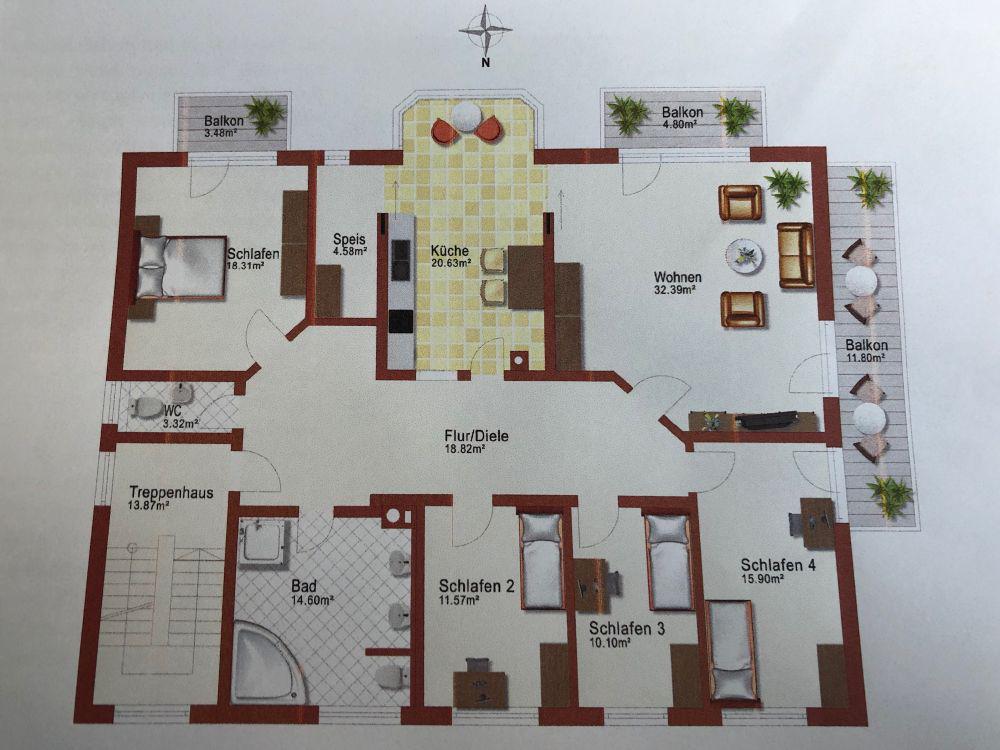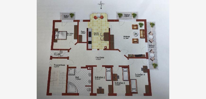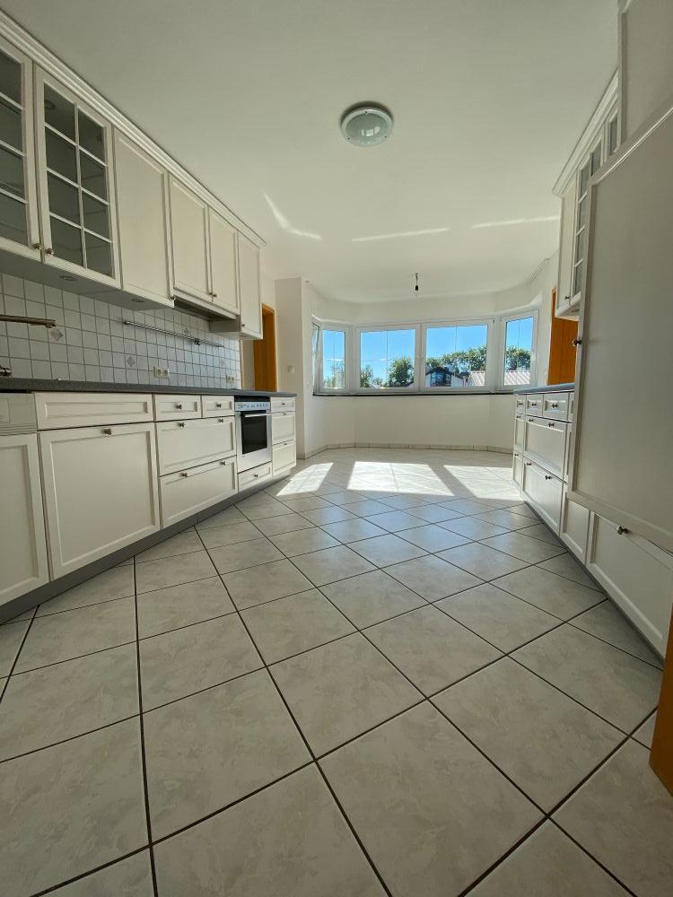 Eine weiße Landhausküche mit Erker und Vorratsraum rundet ihre neue Wohnung ab. Die Wohnung wird über eine Fußbodenheizung aus dem Fernwärmenetz beheizt. Parkett im Wohnzimmer, Fliesen und Designböden in Bad und den unterschiedlich nutzbaren hübschen Zimmern sind hell und leicht zu pflegen. Bad und Gäste WC verfügen über große Fenster. Genießen Sie entspannte Stunden auf den neuen Balkonen in Süd und Westlage mit einer Fläche von 20m² sowie einer elektrisch fernbedienbaren Markise am Westbalkon.